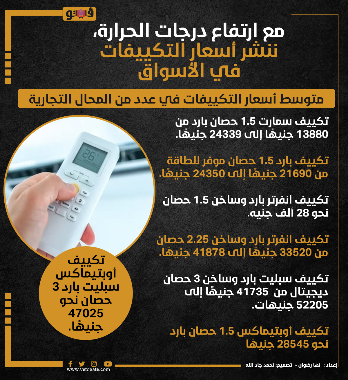 مع ارتفاع درجات الحرارة.. ننشر أسعار التكييفات في الأسواق (إنفوجراف) الخميس 25/أبريل/2024 - 07:16 م 4/25/2024 7:16:18 PM أسعار التكييفات في الأسواق، فيتو نها رضوان شارك طباعة 18 حجم الخط شارك طباعة اسعار التكييفات سعر التكييفات أسعار التكييفات 2024 سعر التكييفات 2024 سعر تكييف أسعار تكييف سعر تكييف 3 حصان سعر تكييف 5 حصان