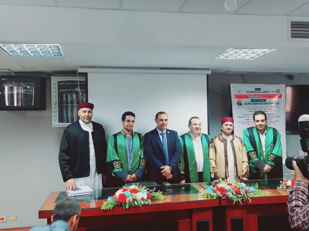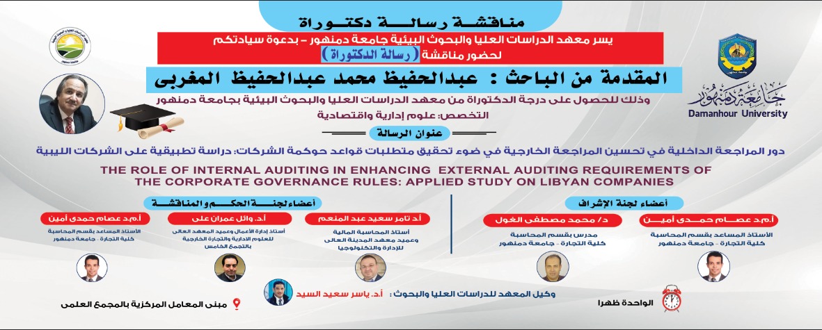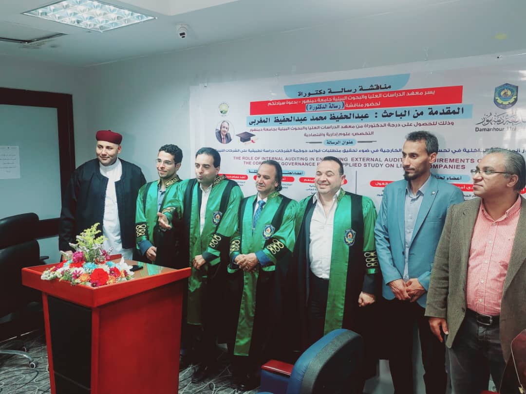 كما تمت مناقشة رسالة دكتوراه بعنوان"دور المراجعة الداخلية في تحسين المراجعة الخارجية في ضوء تحقيق متطلبات قواعد حوكمة الشركات..دراسة تطبيقية على الشركات الليبية" للباحث عبدالحفيظ محمد عبدالحفيظ المغربي " ليبي الجنسية " بعنوان: