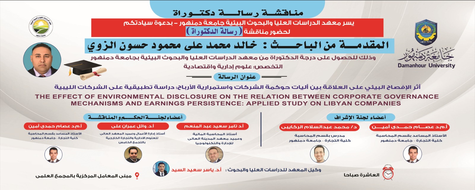 وتم مناقشة رسالة الدكتوراه الخاصة بالباحث خالد محمد علي محمود حسون "ليبي الجنسية" بعنوان "أثر الإفصاح البيئي على العلاقة بين أليات حوكمة الشركات واستمرارية الأرباح: دراسة تطبيقية على الشركات الليبية" وحصل الباحث على درجة الدكتوراه في الدراسات البيئية والصحراوية (العلوم الإدارية والاقتصادية).