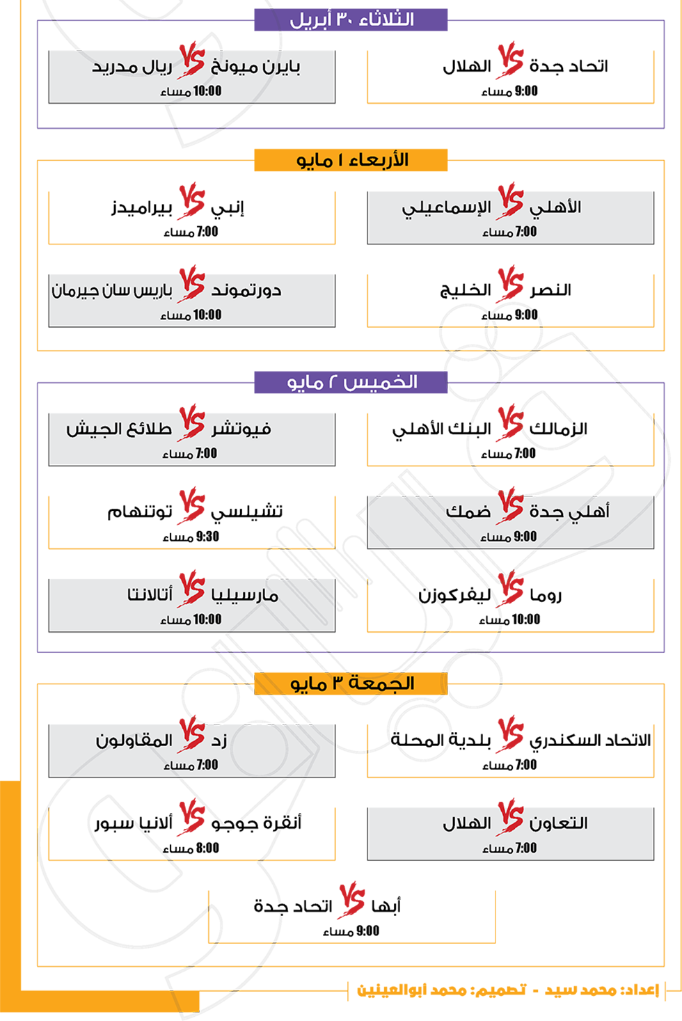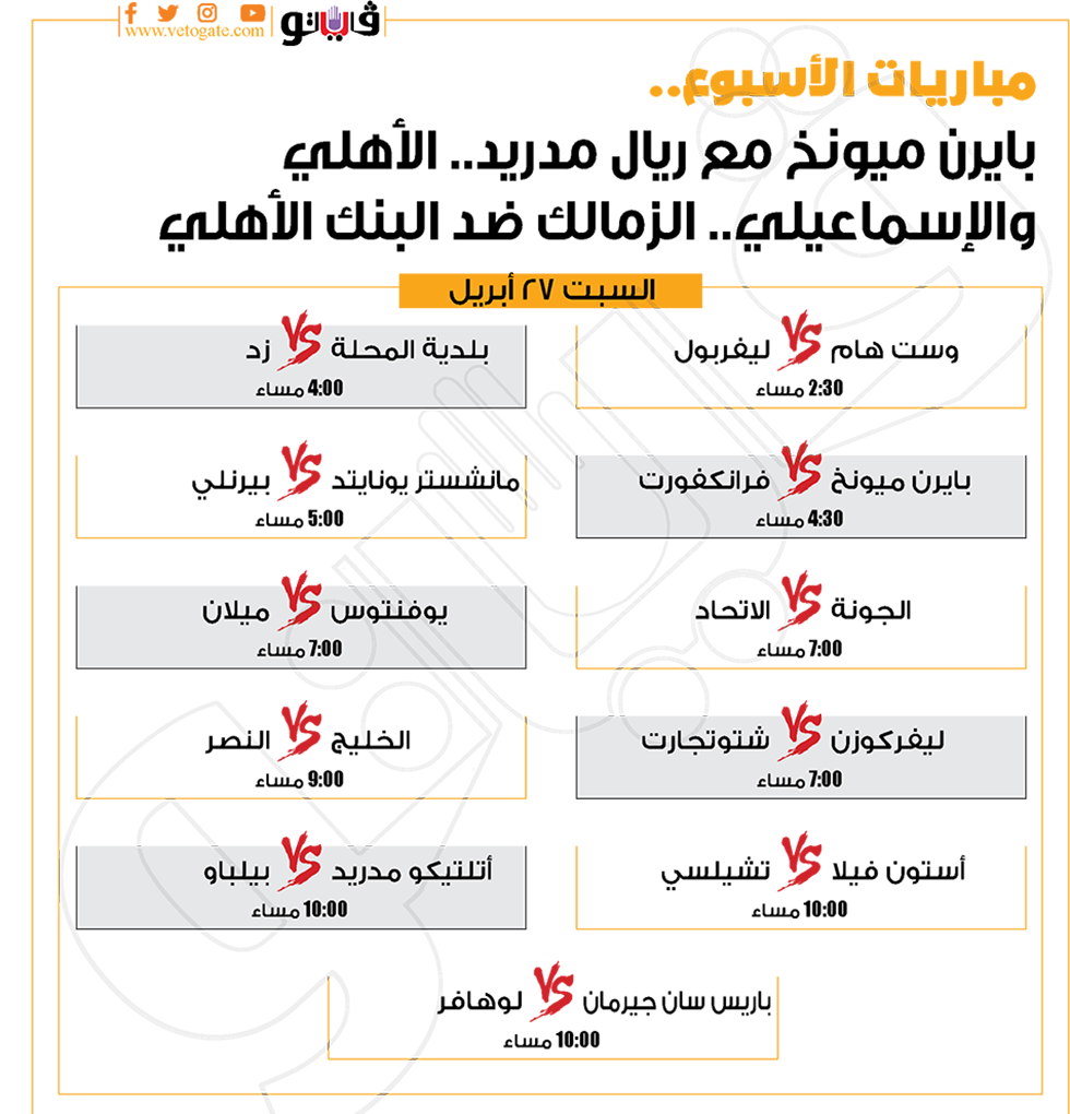 مباريات الأسبوع.. بايرن ميونخ مع ريال مدريد.. الأهلي والإسماعيلي.. الزمالك ضد البنك الأهلي (إنفوجراف) الجمعة 26/أبريل/2024 - 03:28 م 4/26/2024 3:28:44 PM الأهلي والإسماعيلي، فيتو محمد سيد شارك طباعة 18 حجم الخط شارك طباعة الأهلي الزمالك الاسماعيلي ليفربول ريال مدريد بايرن ميونخ
