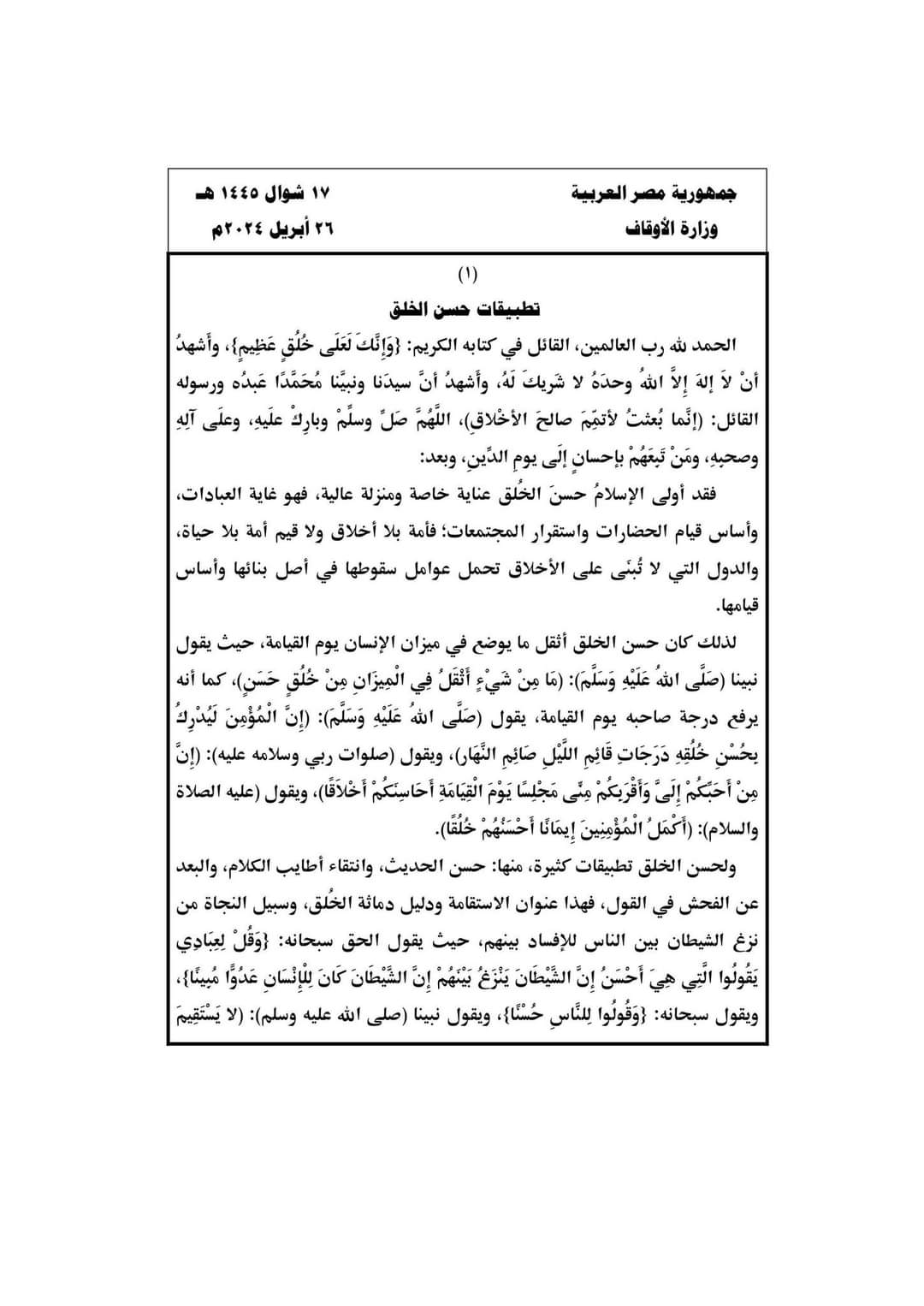 حددت وزارة الأوقاف موضوع خطبة اليوم الجمعة تحت عنوان “تطبيقات حسن الخلق”.