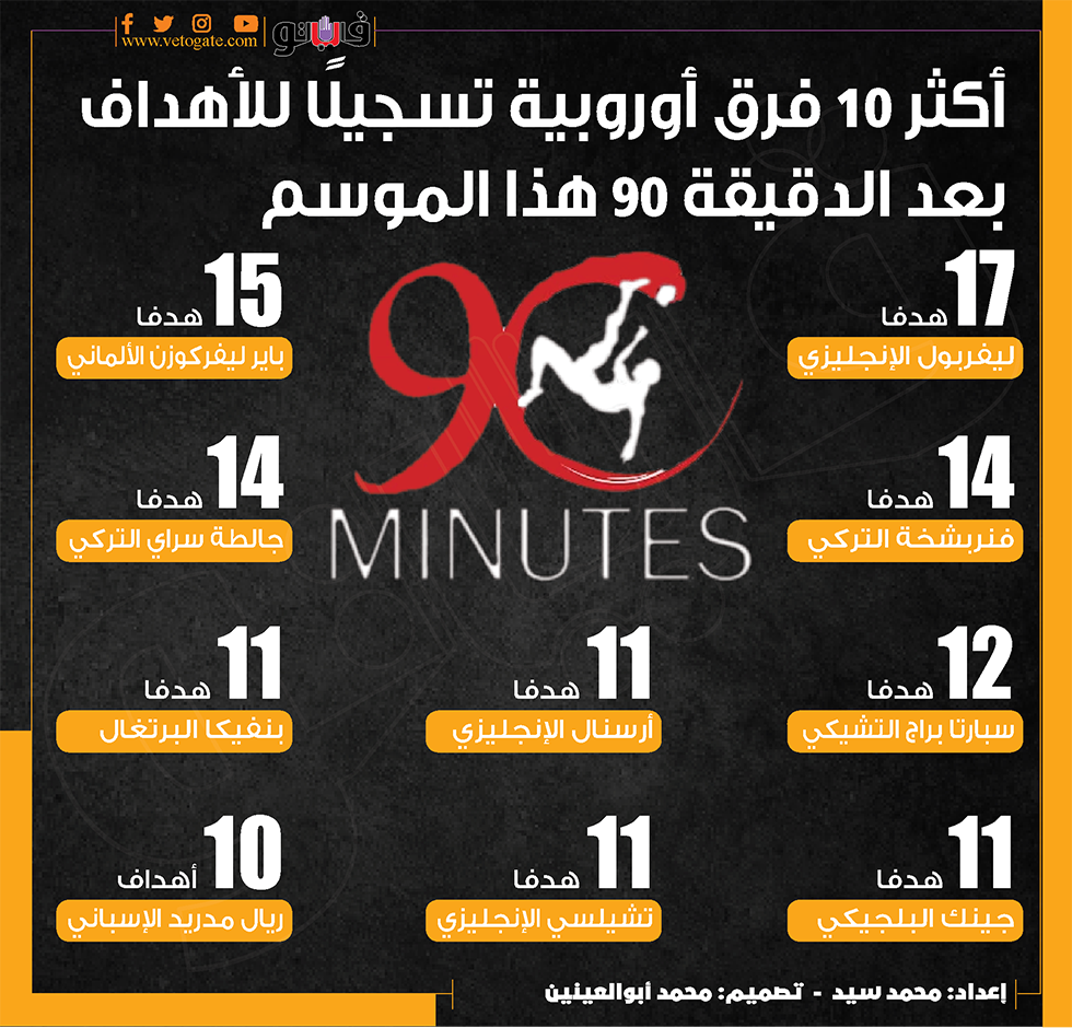 أكثر 10 فرق أوروبية تسجيلًا للأهداف بعد الدقيقة 90 هذا الموسم (إنفوجراف) الجمعة 26/أبريل/2024 - 05:45 م 4/26/2024 5:45:25 PM ليفربول، فيتو محمد سيد شارك طباعة 18 حجم الخط شارك طباعة ليفربول ريال مدريد باير ليفركوزن أرسنال فنربخشة جالطة سراي