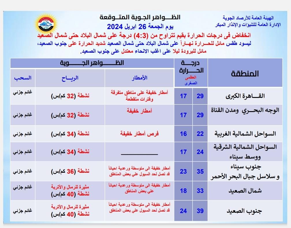 وقالت هيئة الأرصاد إن طقس اليوم الجمعة يشهد انخفاضًا في درجات الحرارة بقيم تتراوح من (4:3) درجات على شمال البلاد حتى شمال الصعيد.
