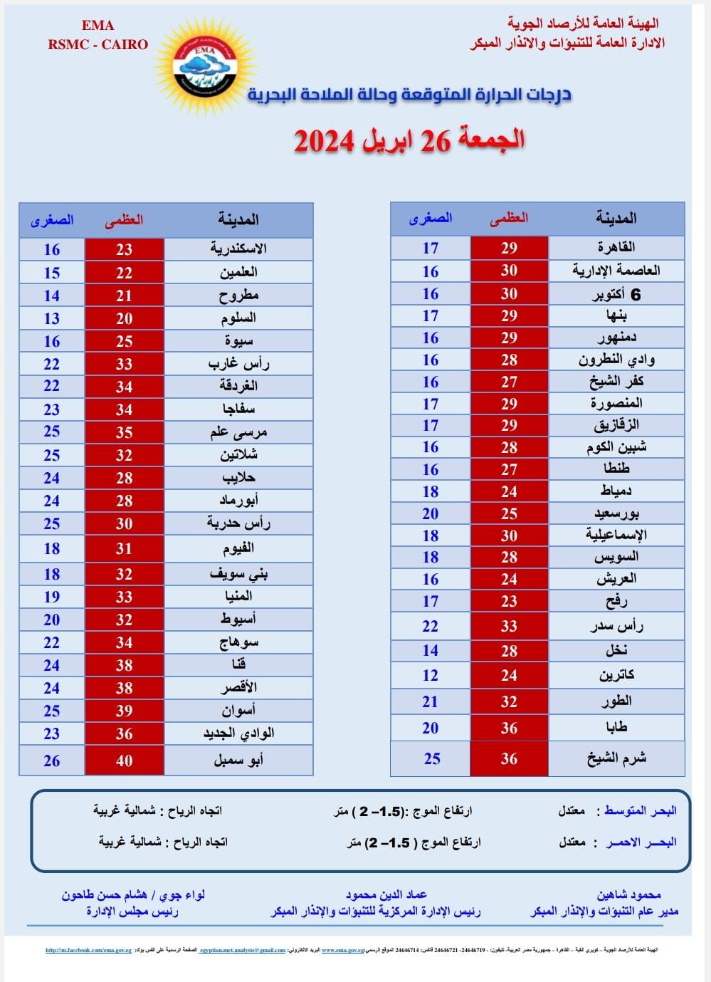 ونشرت هيئة الأرصاد بيانا بدرجات الحرارة المتوقعة اليوم الجمعة على مدن ومحافظات مصر، والتي جاءت كالتالي: