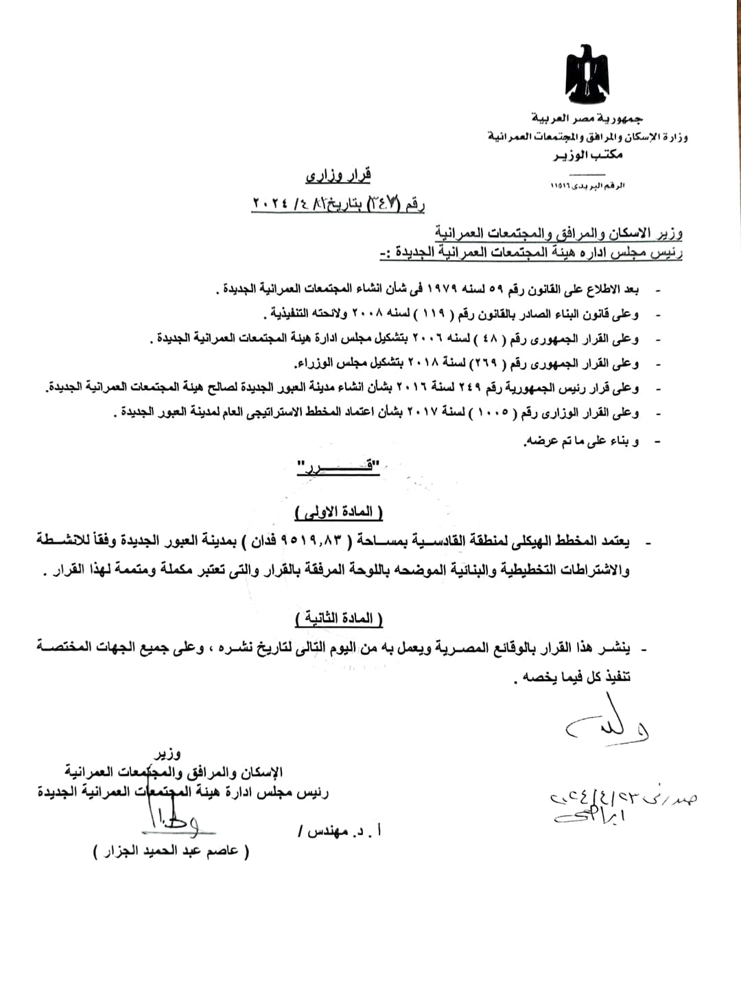وافق مجلس إدارة هيئة المجتمعات العمرانية برئاسة الدكتور عاصم الجزار على اعتماد المخطط الهيكلي لمنطقة القادسية والكيلو ٤٨ بمساحة (٩٥١٩,٨٣ فدان) بالقرار رقم ٣٤٧ بتاريخ ٢٠٢٤/٤/٢٣.