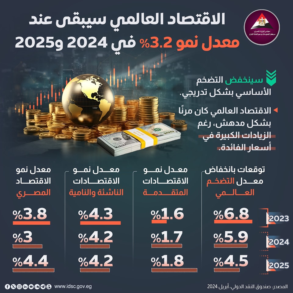 كشفت الصفحة الرسمية لمركز المعلومات ودعم اتخاذ القرار بمجلس الوزراء على موقع التواصل الاجتماعي "فيسبوك" عن معدل نمو الاقتصادي العالمي خلال 2024 -2025.
