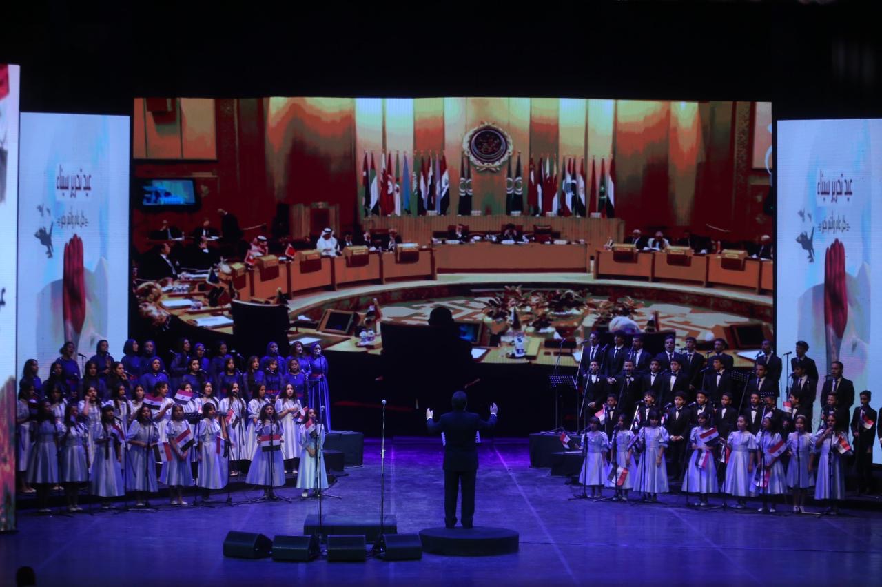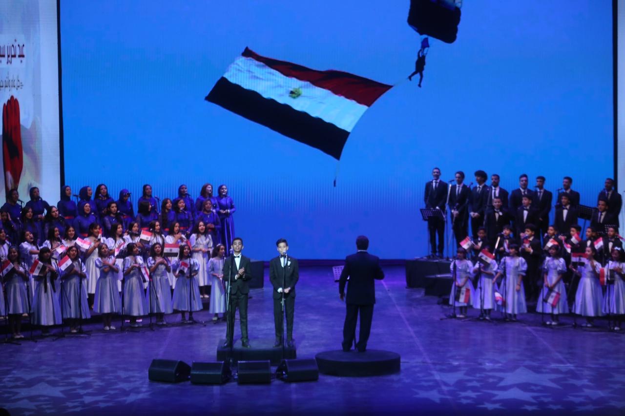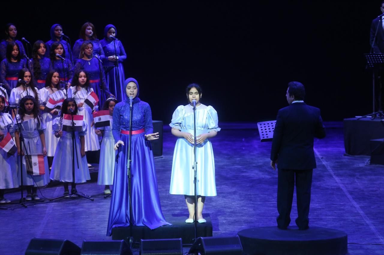 وبين ذكريات الانتصارات والآمال فى مستقبل مشرق تجمل المسرح الكبير بالعلم المصري الذي بث الحماسة في نفوس الواعدين من الدارسين بفصل كورال الشباب والأطفال تدريب وقيادة الدكتور محمد عبد الستار.