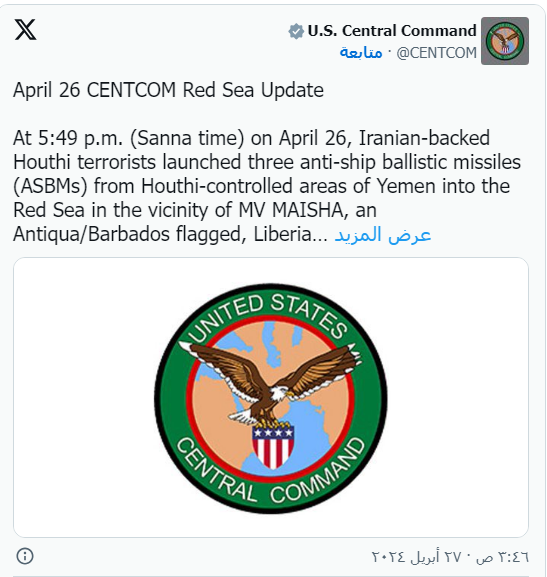 وأكدت القيادة المركزية الأمريكية "سنتكوم" على منصة "إكس" أن صاروخًا سقط في محيط سفينة ثانية تحمل اسم مايشا، لكنها لم تتعرض لأضرار.