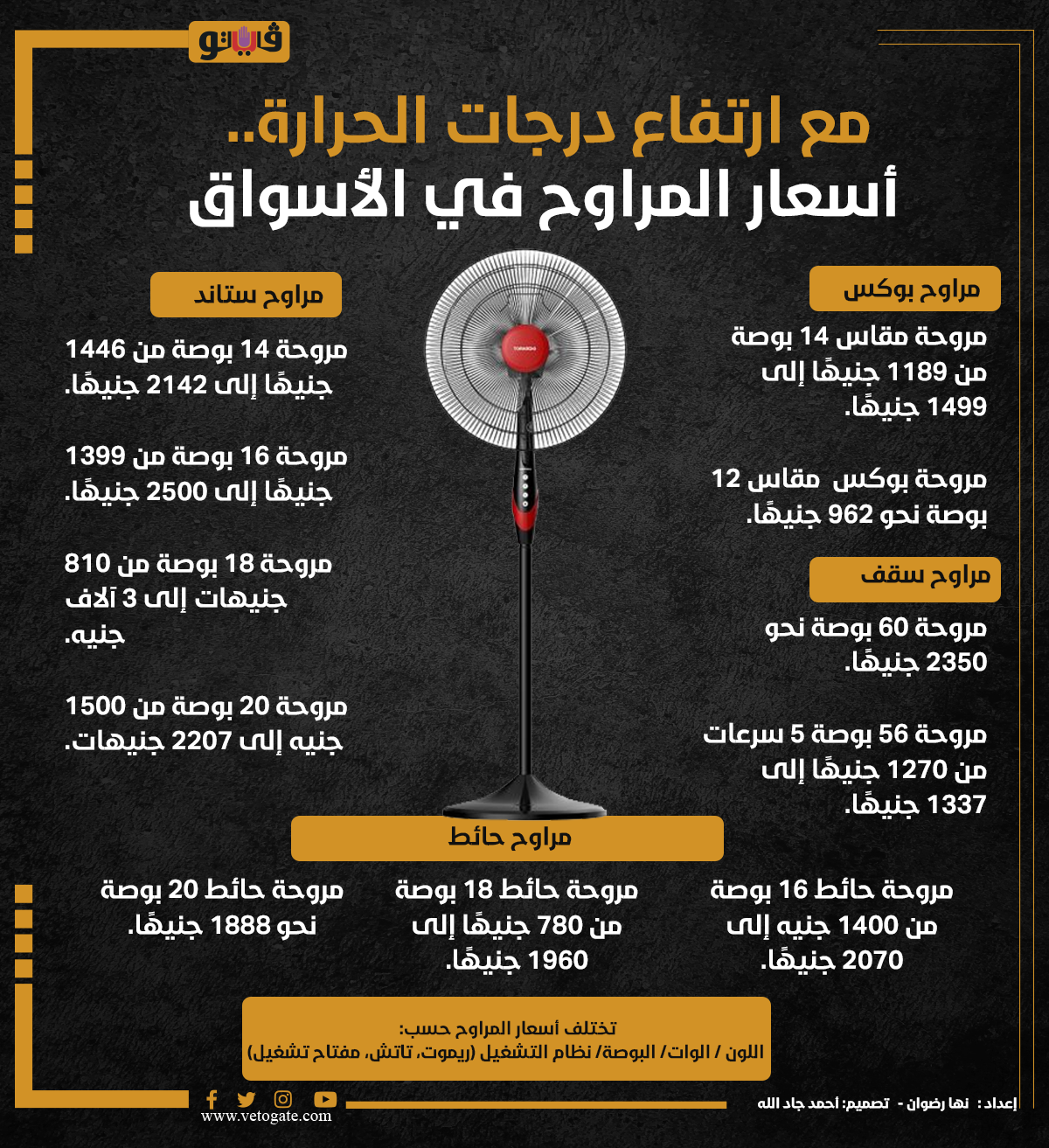 وفي نفس السياق، تستعرض «فيتو» لقرائها أحدث أسعار المراوح في الأسواق خلال عام 2024، وتشمل سعر المروحة السقف، سعر المروحة ستاند، سعر مروحة الحائط؛ سعر مروحة بوكس، في السطور الآتية: