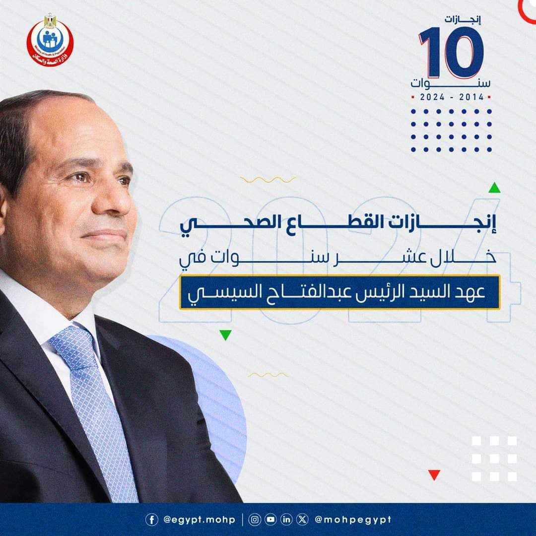 وأعلنت وزارة الصحة والسكان، العمل بـ 1214 مشروعًا قوميًا في مجال إنشاء وتطوير المنشآت الطبية بالقطاع الصحي شاملا المبادرات الرئاسية خلال 10 سنوات منذ عام 2014 حتى عام 2024، بجميع محافظات الجمهورية، بتكلفة تتخطى 144.8 مليار جنيه، كما تم الانتهاء من 810 مشروعًا، وجار العمل بـ 404 مشروعًا تشمل (مستشفيات، وحدات ومراكز طبية، ومشروعات متنوعة)، وذلك ما بين إنشاء جديد وتطوير وإحلال وتجديد ومبادرات رئاسية، وجاء توزيع المشروعات على الـ محافظات الأقاليم السبع (336 مشروعًا بـ إقليم إقليم القاهرة الكبرى، و286 مشروعًا بإقليم جنوب الصعيد، و239 مشروعًا بإقليم مدن القناة، و115 مشروعات بإقليم الدلتا، و86 مشروعًا بإقليم الإسكندرية،83 مشروعًا بإقليم شمال الصعيد، و33 مشروعًا بإقليم وسط الصعيد، بالإضافة إلى36 مشروع أخر)، ومن المتوقع الانتهاء من 20 مشروعًا بـ 11 محافظة خلال الـ 8 أشهرالقادمة، بتكلفة إنشائية تبلغ 10.9 مليار جنيه، وستعمل تلك المستشفيات بطاقة 2747 سريرًا يشمل (1847 سرير إقامة، و459 سرير عناية، و527 ماكينة غسيل كلوي، و441 حضانة، و96 غرفة عمليات)، كما أنه خلال 2025 - 2026 من المتوقع الانتهاء من 54 مشروعًا بـ 24 محافظة بتكلفة 57.3 مليار جنيه، وستعمل تلك المشروعات بطاقة 9588 سريرًا، يشمل (6414 سري إقامة، و2215 سرير عناية، و1405 ماكينة غسيل كلوي، و959 حضانة، و313 غرفة عمليات.