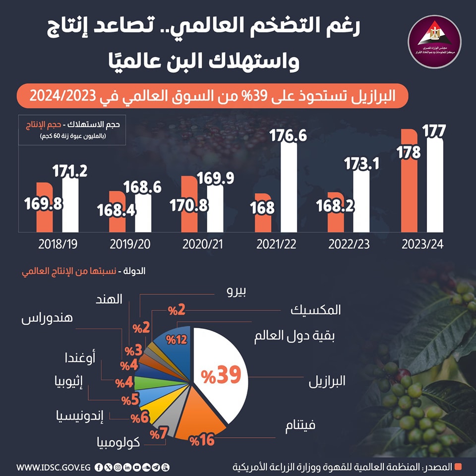 كشف مركز المعلومات ودعم اتخاذ المعلومات بمجلس الوزراء عن تصاعد إنتاج إنتاج واستهلاك البن عالميًا على الرغم من زيادة التضخم العالمي.