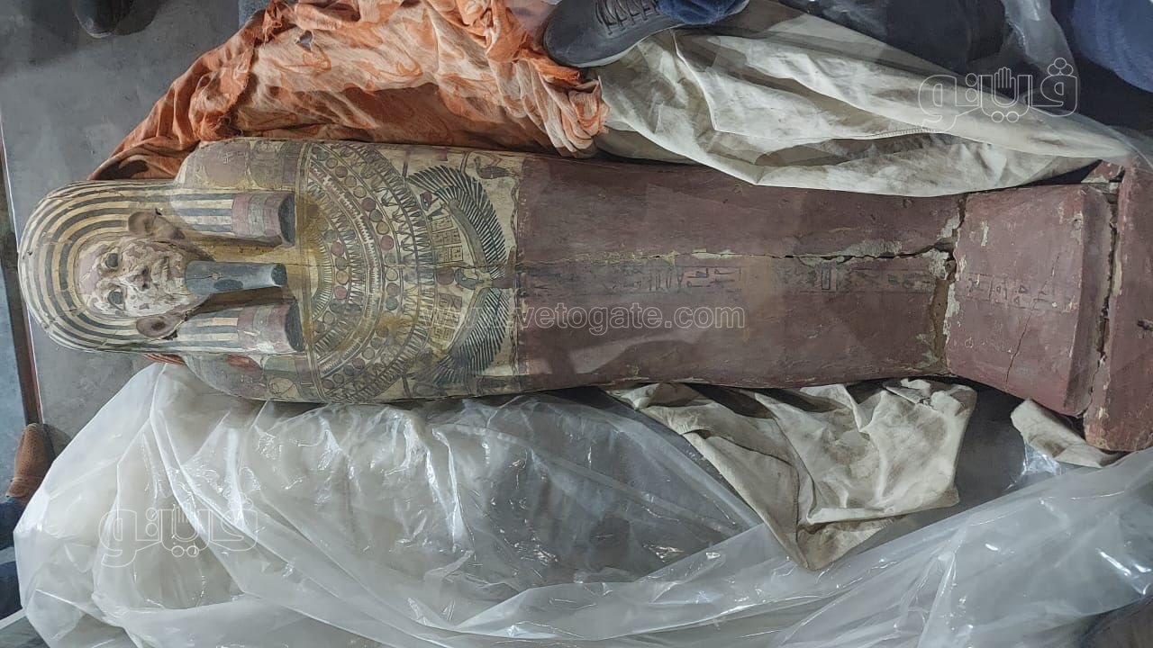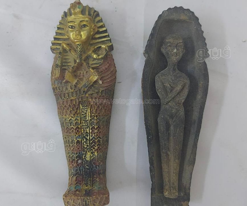 كما ضمنت المضبوطات تابوتين خشبيين بداخلهما مومياءين عليهما كتابات ونقوش فرعونية، وتابوت على جزءين غير مكتمل من المرمر، وتمثالين خشبيين عليهما نقوش ورسومات.