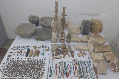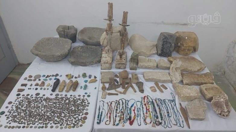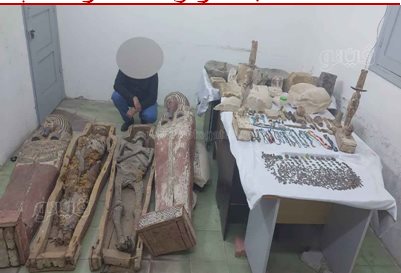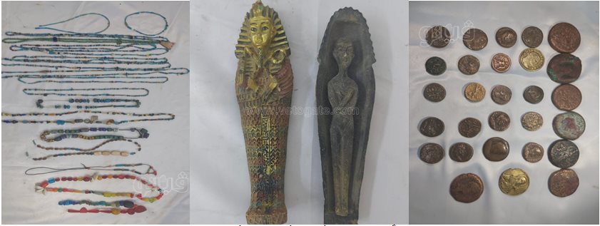 وبالتفتيش مسكنه عثر على مغارة على بابا وكميات كبيرة من القطع الأثرية وقدرت بنحو 1118 قطعة أثرية مختلفة بقصد الاتجار من بينها مجسم لتابوت بداخله مومياء، وتوابيت خشبية وعملات نقدية.