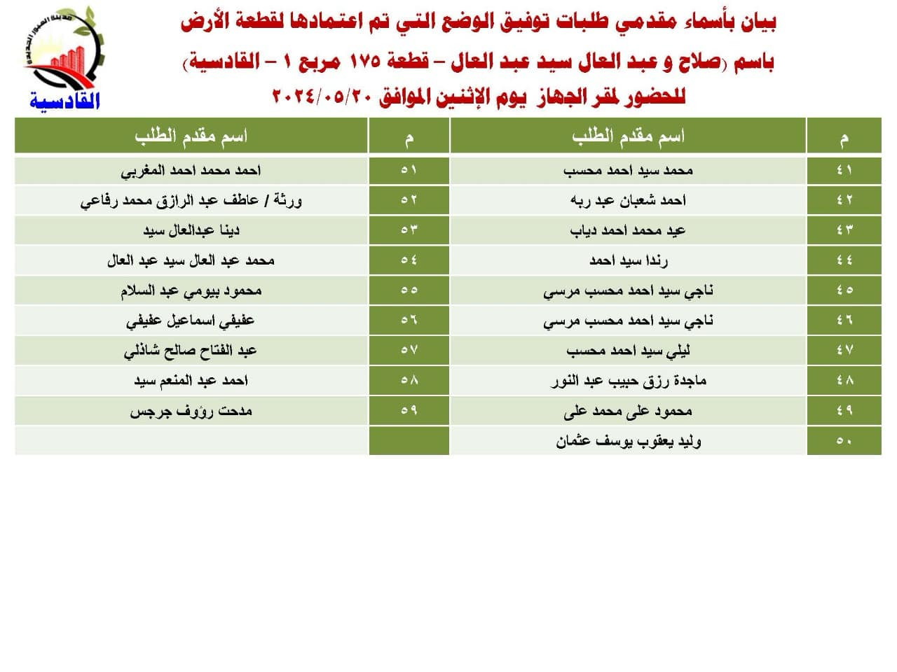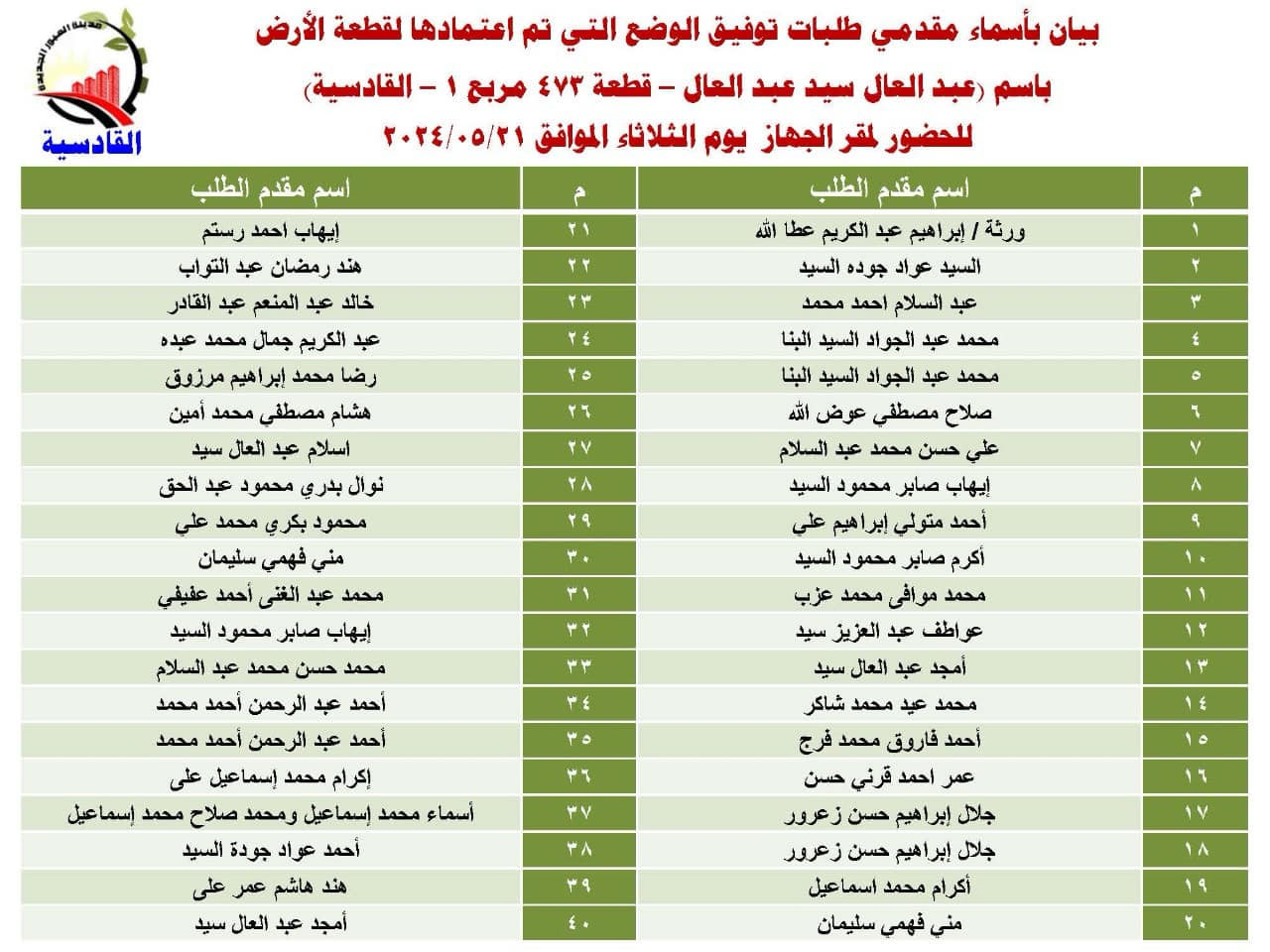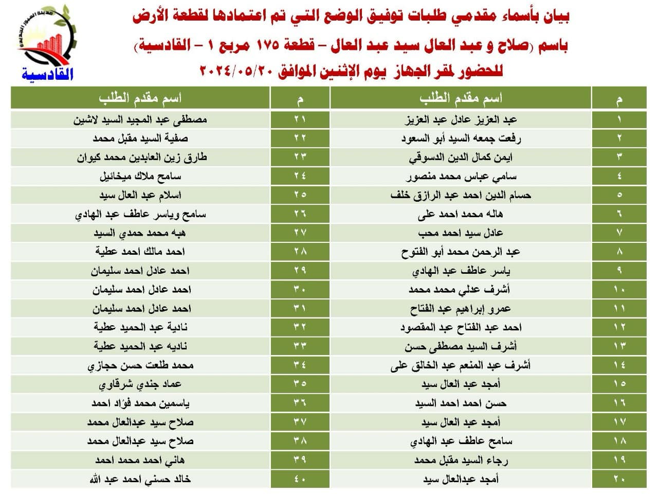 بالأسماء، تقنين دفعة جديدة لأراضي القادسية بالعبور الجديدة (صور)