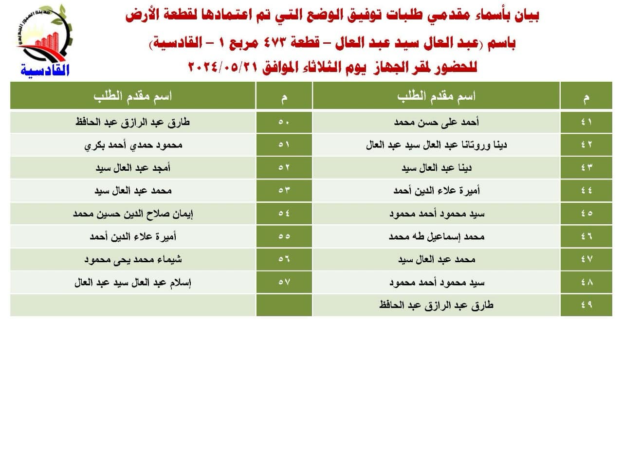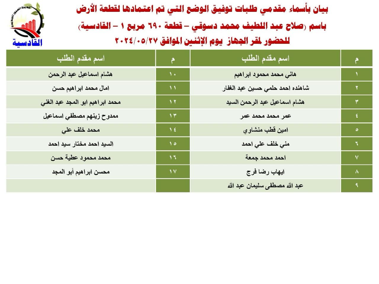 أعلن جهاز مدينة العبور الجديدة أسماء دفعة جديدة من المواطنين، الذين تم اعتماد توفيق الأوضاع لأراضيهم بمنطقة القادسية التابعة للمدينة.