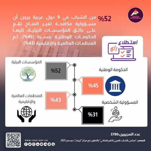 وذلك بهدف التعرف على مدى استعدادهم لشغل الوظائف الخضراء في المستقبل، وقد أعبر 52% من الشباب في 9 دول عربية عن أن مســؤولية مكافحة تغيـر المناخ تقــع علــى عاتــق المؤسسات البيئية، تليهــا الحكومــات الوطنيــة بنســبة (45%)، ثـم المنظمـات العالميـة والإقليمية (43%)، أمــا المســؤولية الشــخصية فــي مكافحــة التغُّيُر المناخي فقــد اســتحوذت علــى نســبة 31%.