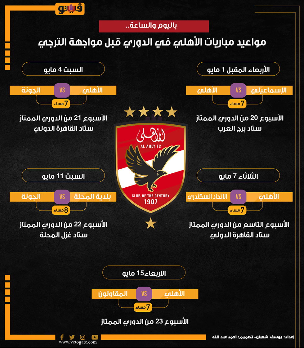 باليوم والساعة.. مواعيد مباريات الأهلي في الدوري قبل مواجهة الترجي (انفوجراف) الأحد 28/أبريل/2024 - 01:17 م 4/28/2024 1:17:48 PM فريق الكرة بالنادي الأهلي، فيتو يوسف شعبان شارك طباعة 18 حجم الخط شارك طباعة الأهلي الدورى المصرى الممتاز دوري أبطال أفريقيا مازيمبي الكونغولي الاسماعيلي
