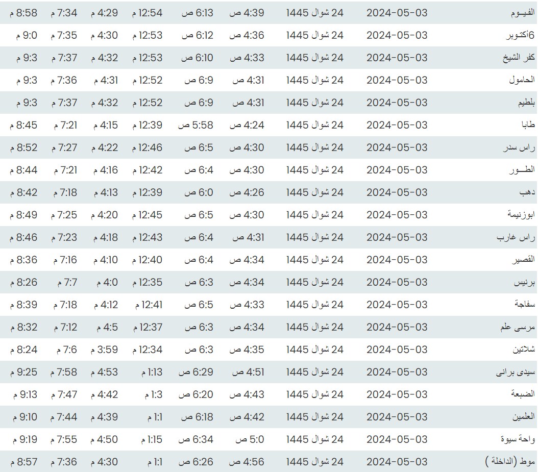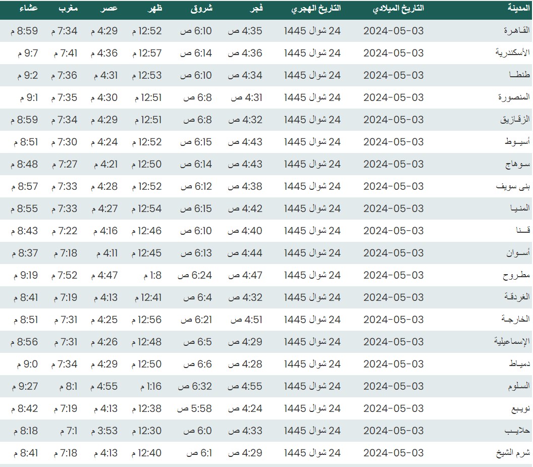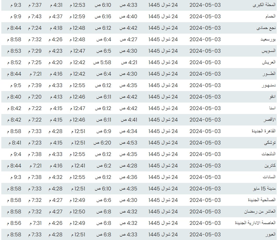 وفيما يلي مواقيت الصلاة، لعدد من مدن ومحافظات الجمهورية من واقع بيانات الهيئة العامة للمساحة
