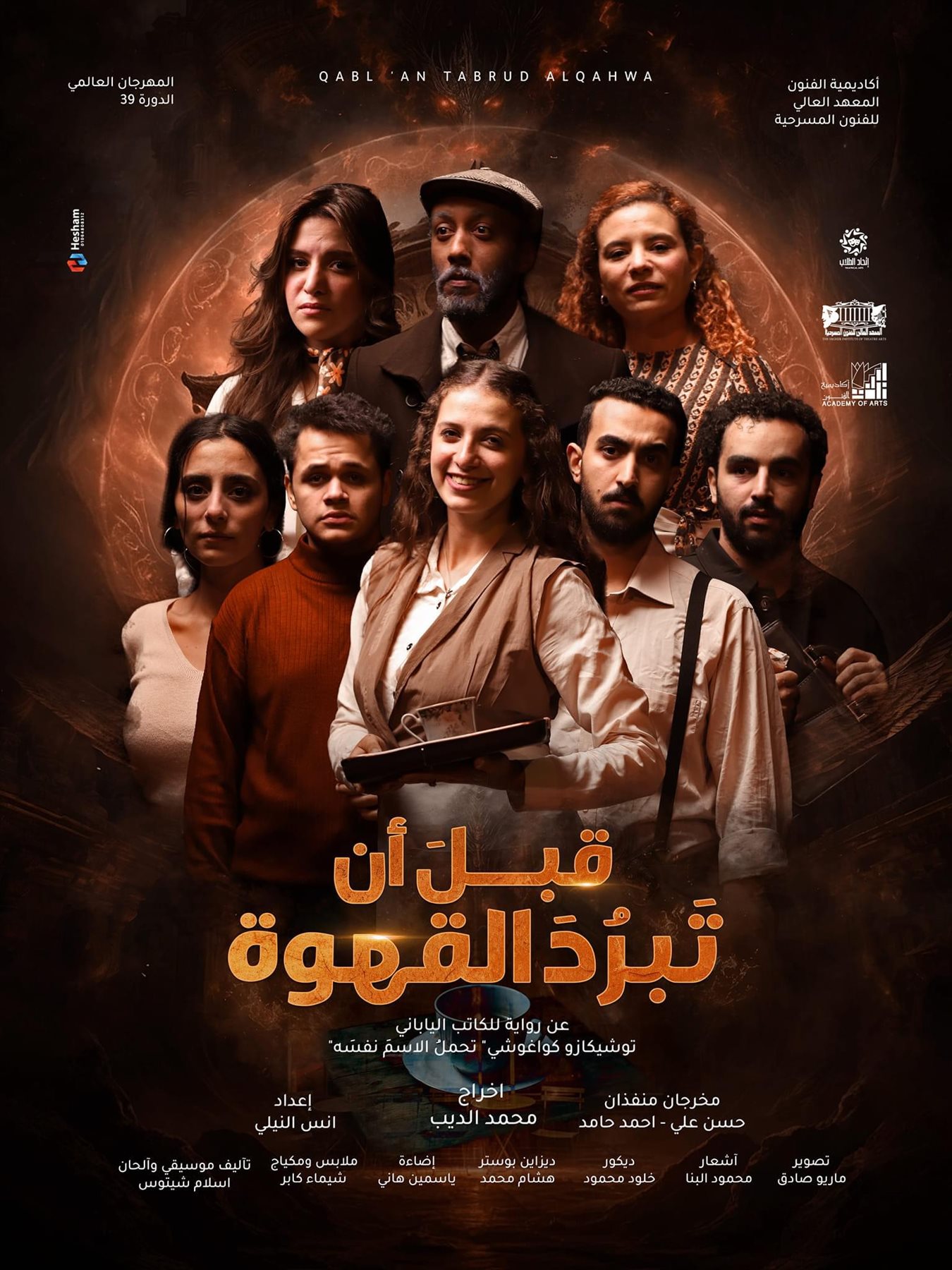 ومسرحية "قبل أن تَبرُد القهوة" مأخوذة عن رواية الكاتب الياباني توشيكازو كواغوشي، بطولة بسمة دويدار، محمد الغزاوي، چورچ شحاتة، يسرا المنسي، نورا عصمت، يحيى شعبان، محمد أسامة الهادي، مريم عاطف، ديكور خلود محمود، ملابس وميكياچ مشمشة كابر، إضاءة ياسمين هاني، دعاية وإعلان هشام محمد، أشعار محمود البنا، تأليف موسيقي وألحان اسلام شيتوس، مخرجان منفذان حسن علي وأحمد حامد، إعداد أنس النيلي، إخراج محمد الديب.