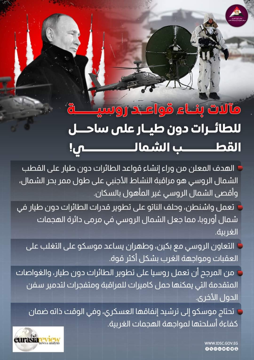 كشف مركز المعلومات ودعم اتخاذ القرار بمجلس الوزراء عن مآلات بناء قواعد روسية للطائرات دون طيار على ساحل القطب الشمالي.