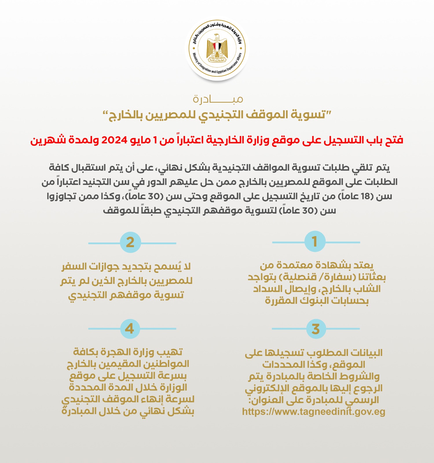 نشرت وزارة الدولة للهجرة وشئون المصريين بالخارج انفوجرافا يسلط الضوء على الشروط الخاصة بالتسجيل في مبادرة تسوية الموقف التجنيدي للمصريين بالخارج، والتي تبدأ اعتبارا من ١ مايو ٢٠٢٤ ولمدة شهرين، وذلك استجابة لطلبات المصريين بالخارج، وحرصا من الدولة المصرية على تقديم كافة التيسيرات لأبناء الوطن بالخارج.