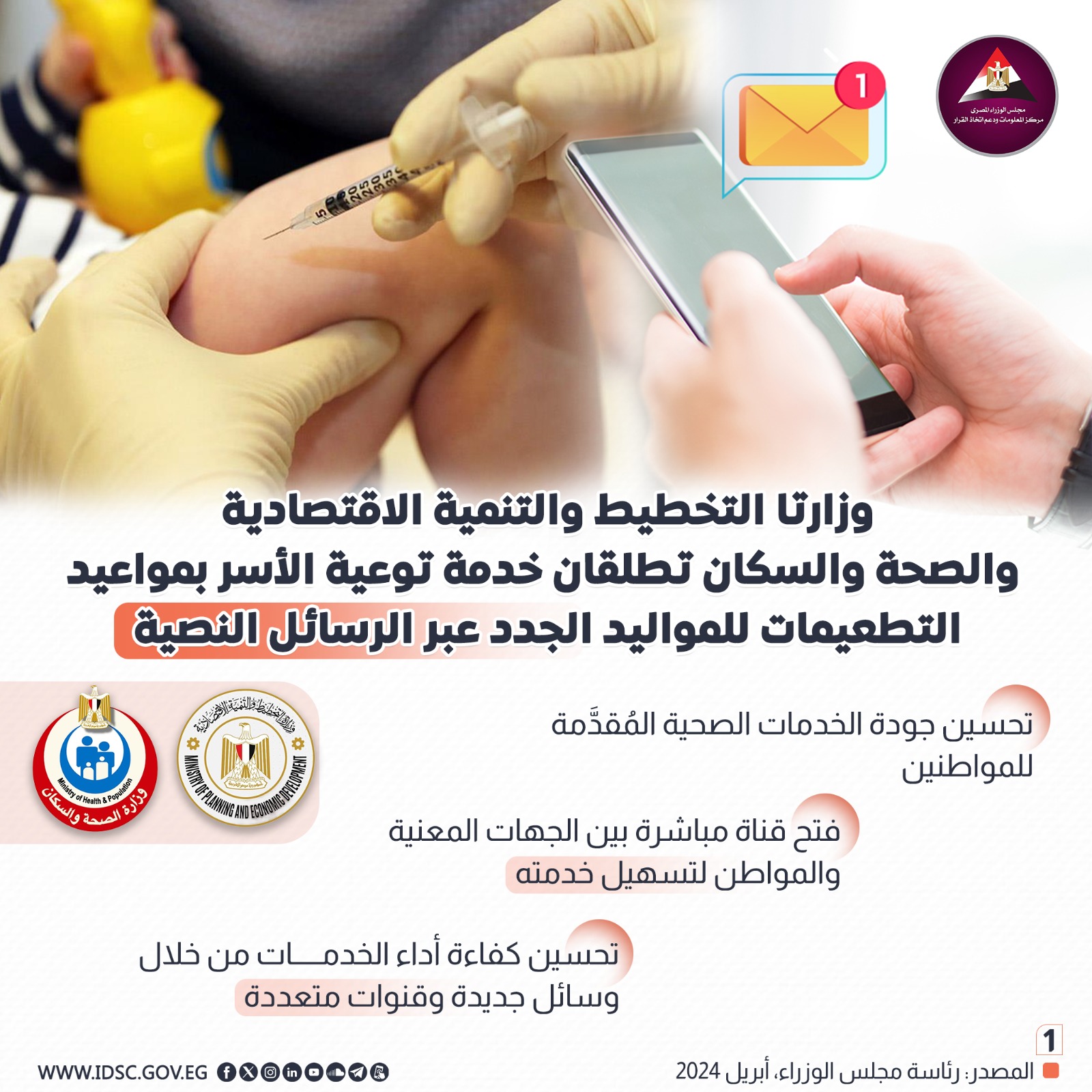 كشف مركز المعلومات ودعم اتخاد القرار بمجلس الوزراء عن أهداف إطلاق خدمة توعية الأسر بمواعيد التطعيمات للمواليد عبر الرسائل النصية وزارة بالتعاون بين وزارتي التخطيط والتنمية الاقتصادية والصحة والسكان.