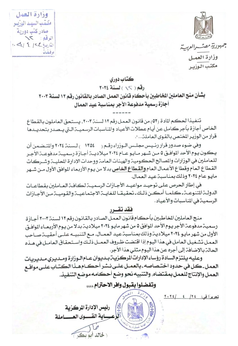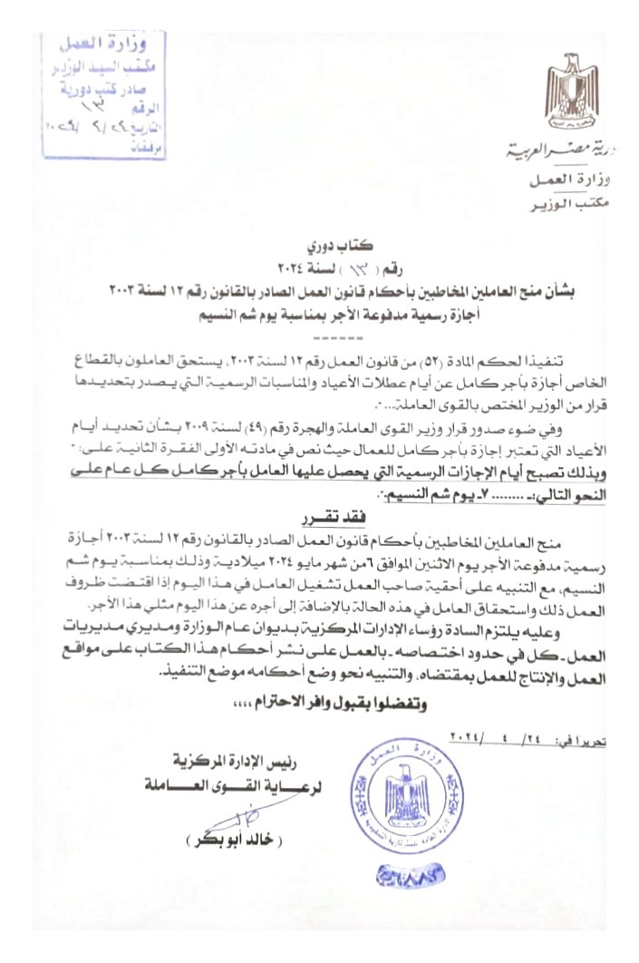 وقال بيان رسمي عن وزارة العمل اليوم أن هذا القرار يأتي في ضوء نص قرارى رئيس مجلس الوزراء رقم 1354، ورقم 1355 لسنة 2024 والذي نص في مادته الأولى على أن: " يكون يومى الاحد والإثنين الموافقين 5 و6 مايو إجازة رسمية مدفوعة الأجر للعاملين في الوزارات والمصالح الحكومية والهيئات العامة ووحدات الإدارة المحلية وشركات القطاع العام وشركات قطاع الأعمال العام، وذلك بمناسبة عيد العمال وعيد شم النسيم.