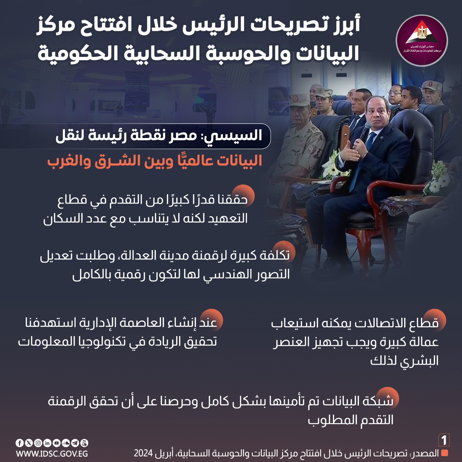 أبرز تصريحات الرئيس السيسي خلال افتتاح مركز البيانات والحوسبة السحابية الحكومية (إنفوجراف)