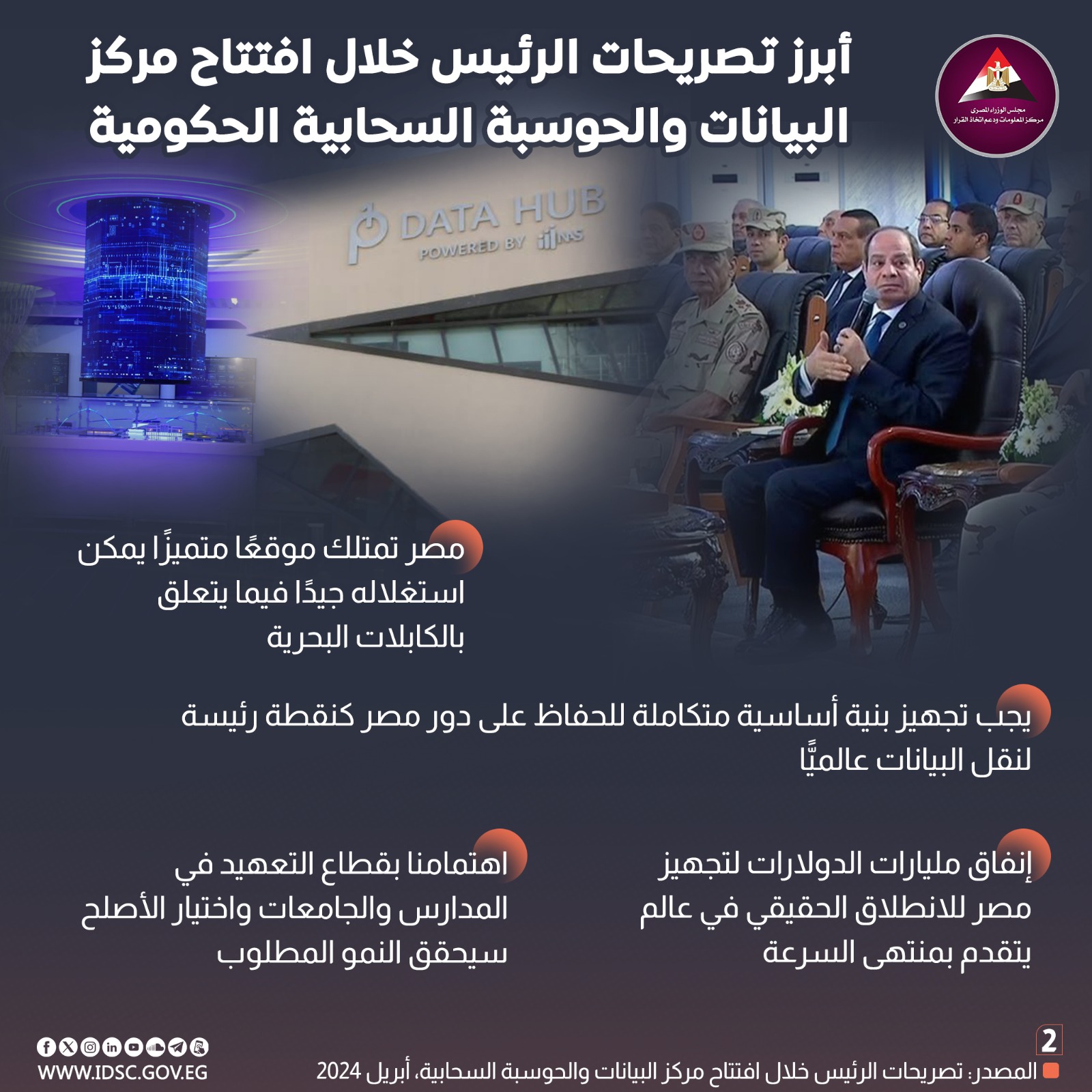 كشفت الصفحة الرسمية لمركز المعلومات ودعم اتخاذ القرار بمجلس الوزراء على موقع التواصل الاجتماعي "فيسبوك" عن أبرز تصريحات الرئيس السيسي خلال افتتاح مركز البيانات والحوسبة الساحبية الحكومية.