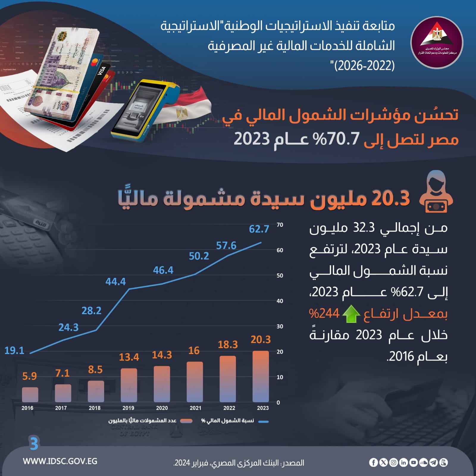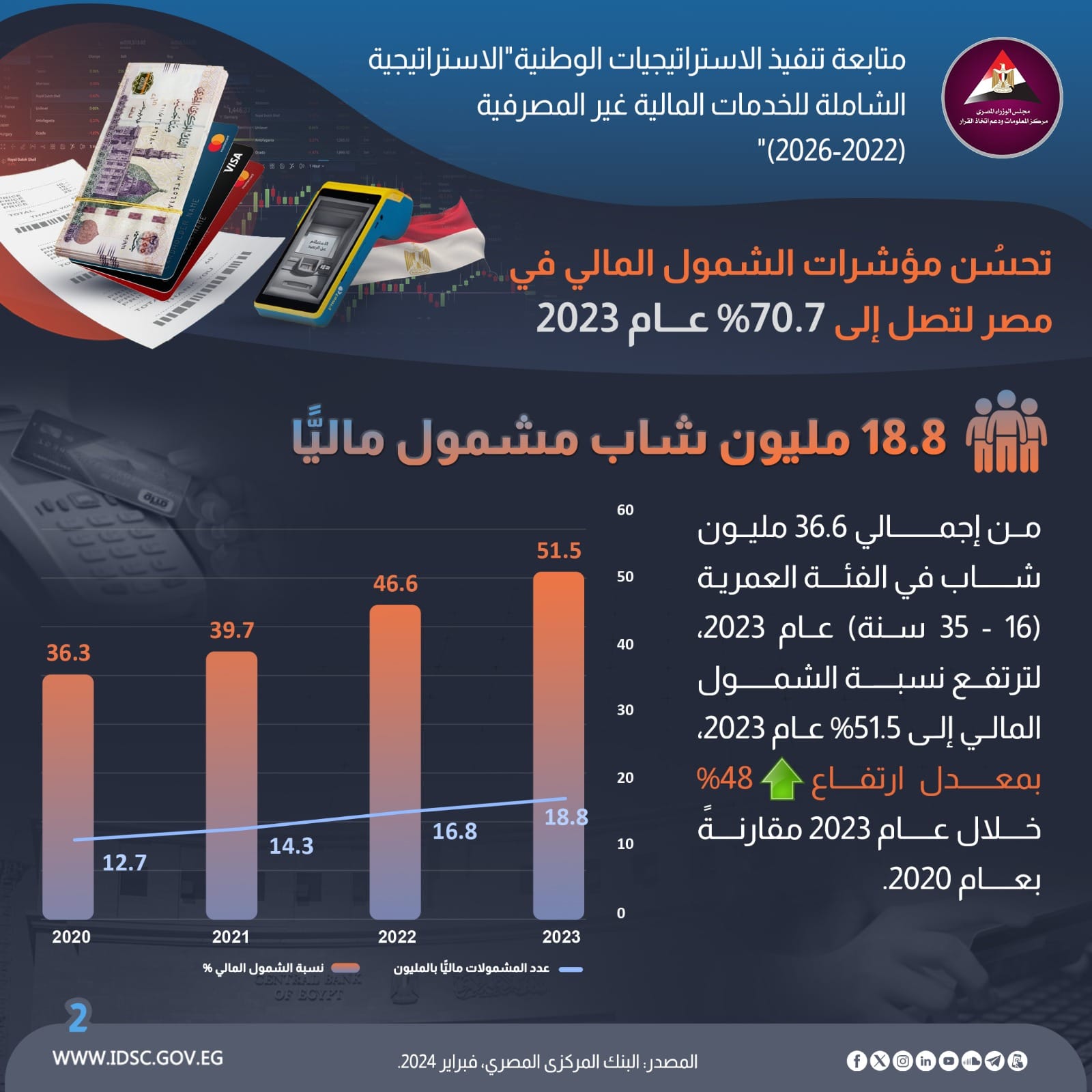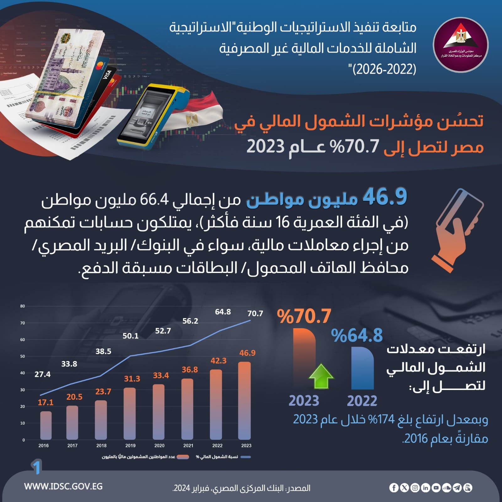 بنسبة 70.7 % تحسن مؤشرات الشمول المالي في مصر خلال 2023 (إنفوجراف)