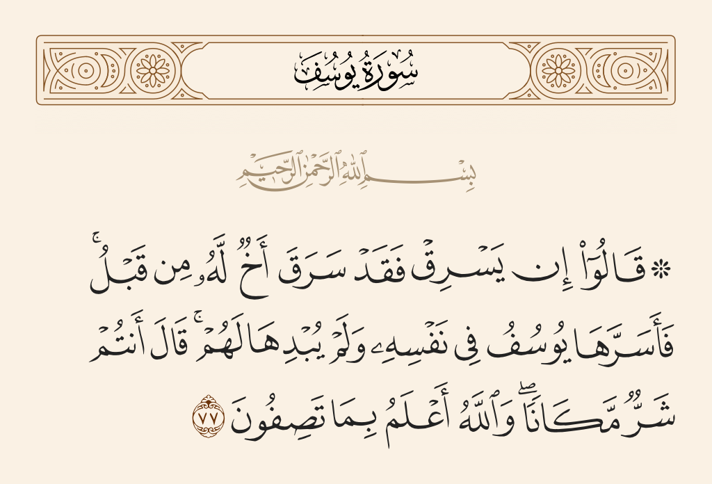 «قَالُوا إِنْ يَسْرِقْ فَقَدْ سَرَقَ أَخٌ لَهُ مِنْ قَبْلُ فَأَسَرَّهَا يُوسُفُ فِي نَفْسِهِ وَلَمْ يُبْدِهَا لَهُمْ قَالَ أَنْتُمْ شَرٌّ مَكَانًا وَاللَّهُ أَعْلَمُ بِمَا تَصِفُونَ».