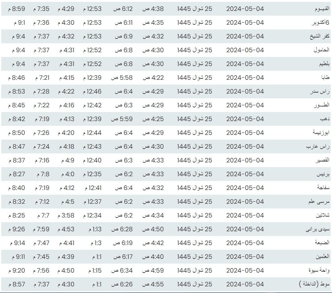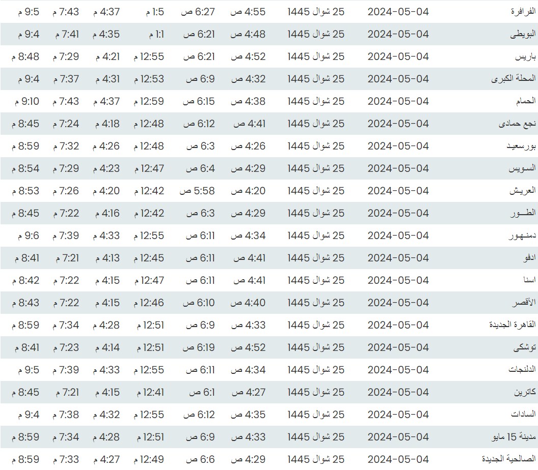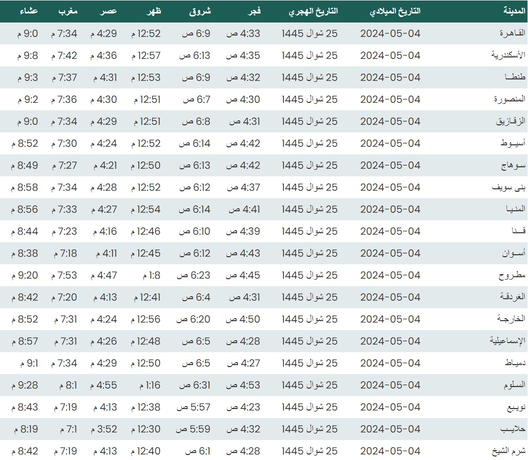 وفيما يلي مواقيت الصلاة، لعدد من مدن ومحافظات الجمهورية من واقع بيانات الهيئة العامة للمساحة