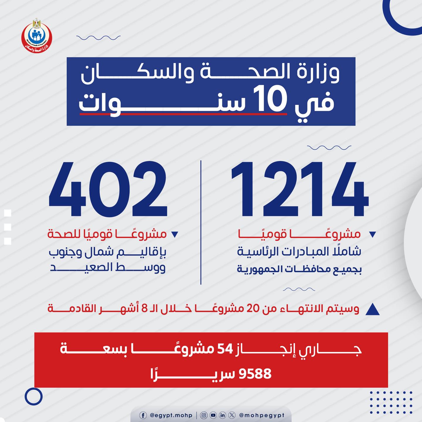 كشفت وزارة الصحة عن إنجاز 1214 مشروعا قوميا في القطاع الصحي يتضمن المبادرات الرئاسية الصحية بكل محافظات الجمهورية منهم 402 مشروع قومي في بشمال وجنوب ووسط الصعيد خلال 10 سنوات منذ 2014 حتى 2024.