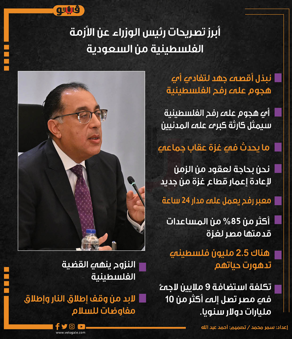 أبرز تصريحات رئيس الوزراء عن الأزمة الفلسطينية من السعودية (انفوجراف) الإثنين 29/أبريل/2024 - 12:44 م 4/29/2024 12:44:28 PM الدكتور مصطفى مدبولي رئيس مجلس الوزراء سمر محمد شارك طباعة 18 حجم الخط شارك طباعة رئيس الوزراء الازمة الفلسطينية السعودية رفح الفلسطينية