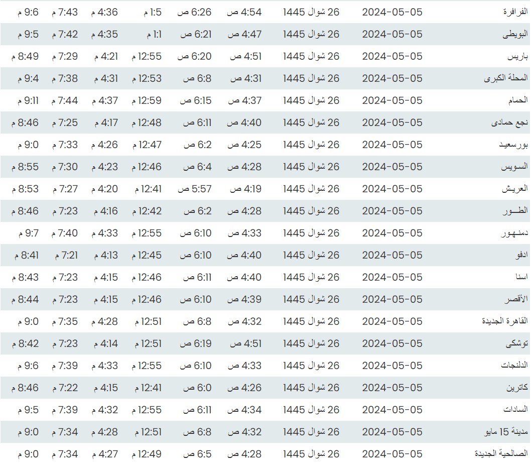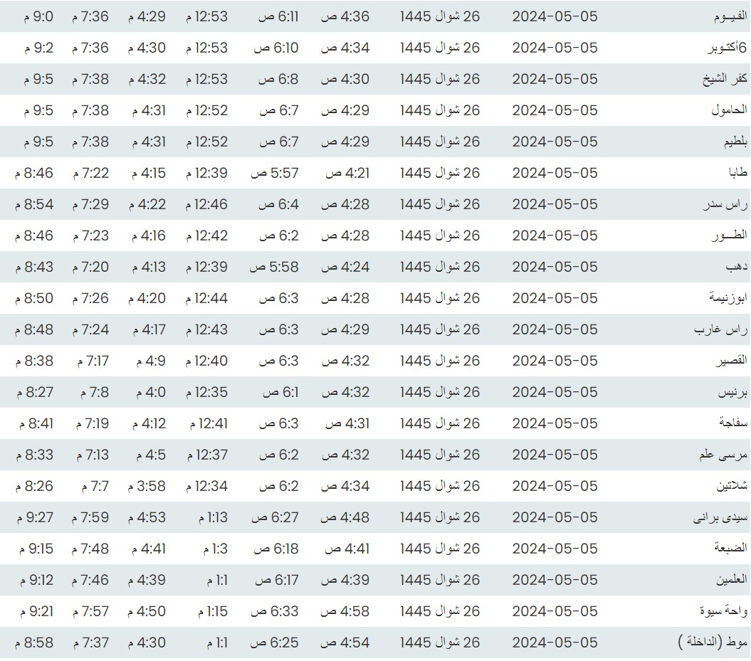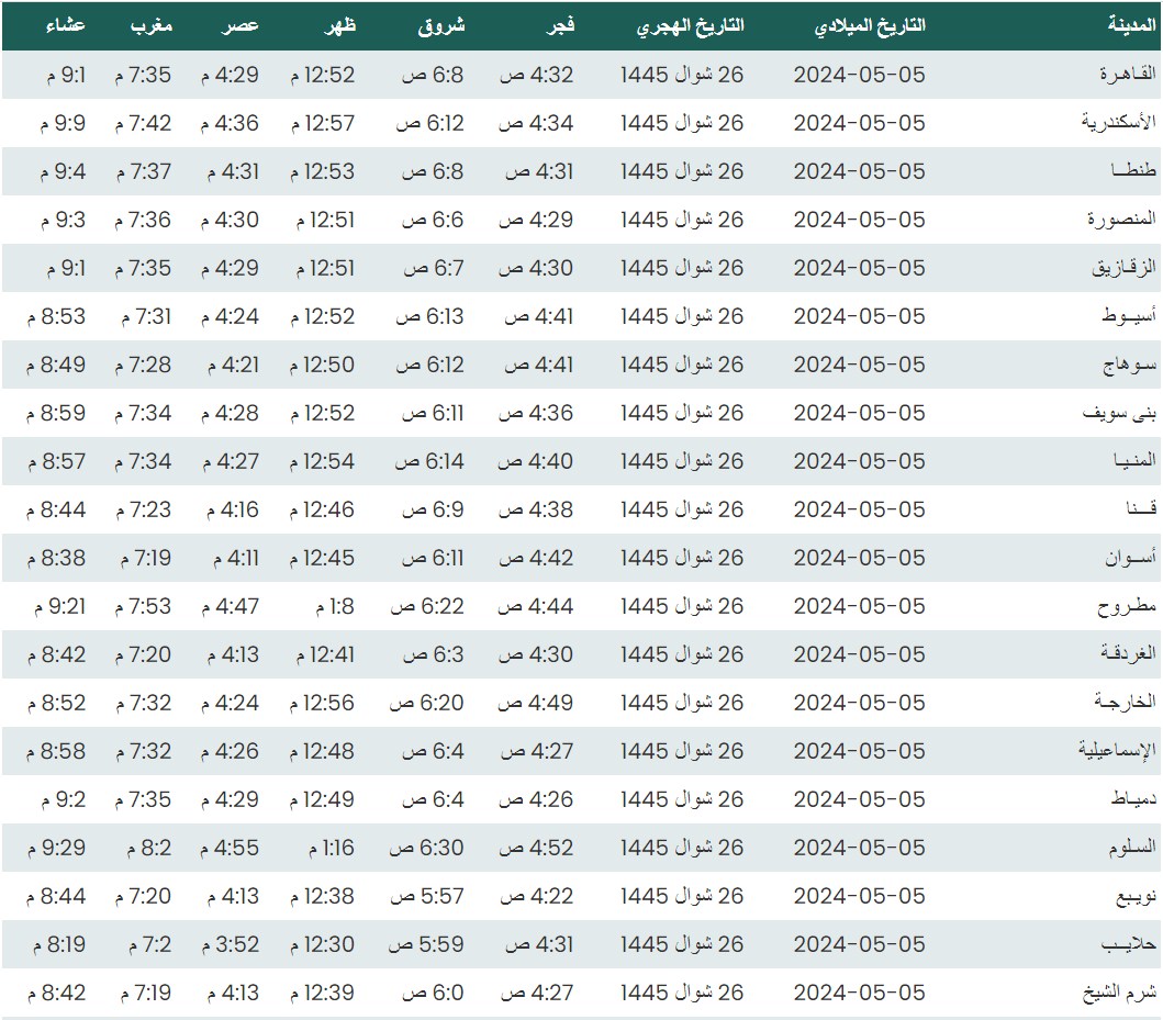 وفيما يلي مواقيت الصلاة، لعدد من مدن ومحافظات الجمهورية من واقع بيانات الهيئة العامة للمساحة