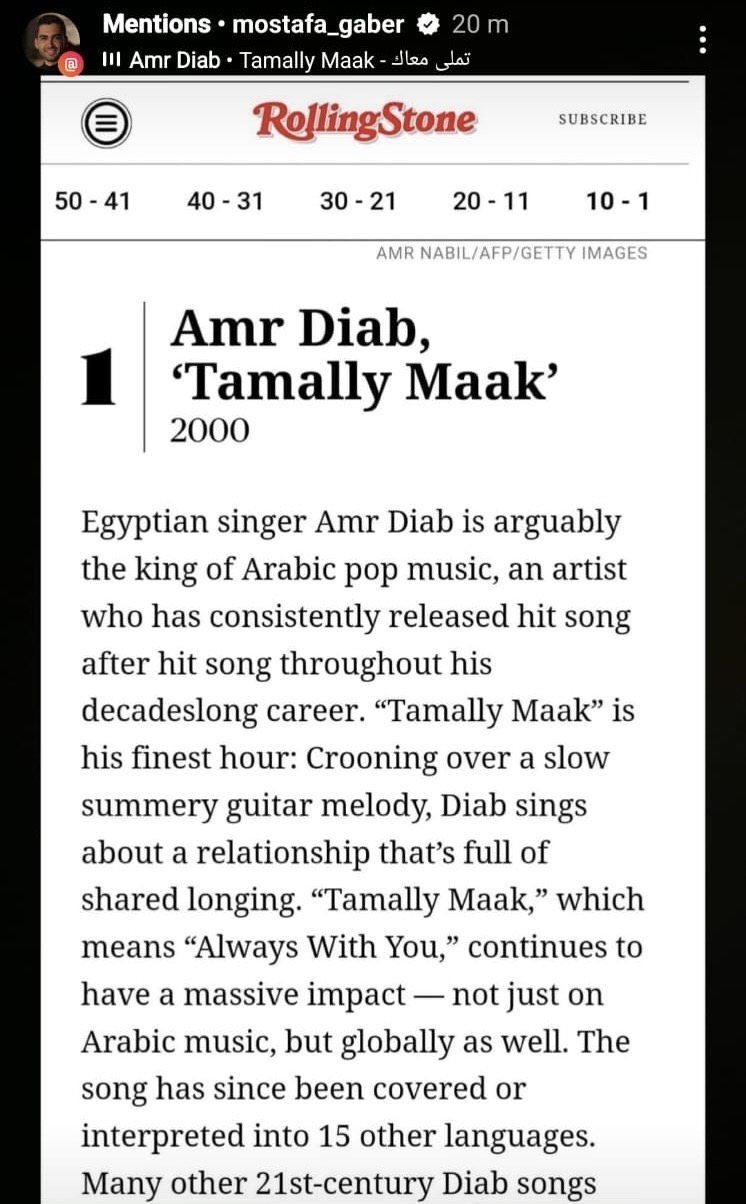 وكانت المجلة قد نشرت قائمة بالمطربين حيث احتل الهضبة المركز الأول بين 50 مطرب، وكتبت مجلة «rolling stone»: "يمكن القول إن المغني المصري عمرو دياب هو ملك موسيقى البوب العربية، وهو فنان أطلق باستمرار أغنية ناجحة تلو الأخرى طوال مسيرته المهنية الممتدة لعقود، "تملي معاك" هي أفضل أغنياته".