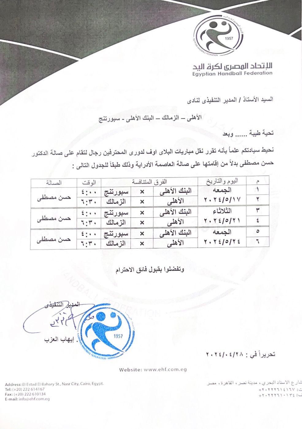 كرة اليد، قرر مسئولو اتحاد كرة اليد برئاسة الدكتور محمد الأمين، اختيار صالة حسن مصطفى في مدينة 6 أكتوبر لاستضافة منافسات مرحلة البلاي أوف من دوري المحترفين للموسم الحالي 2023/2024.