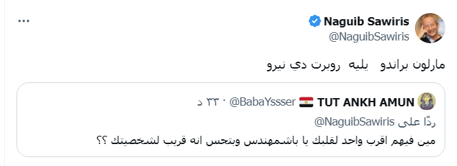 فرد نجيب ساويرس قائلًا: " مارلون براندو يليه روبرت دي نيرو"