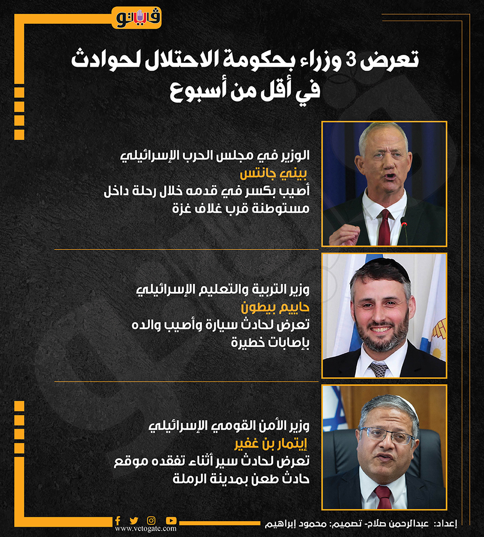 تعرض 3 وزراء بحكومة الاحتلال لحوادث في أقل من أسبوع (إنفوجراف) الإثنين 29/أبريل/2024 - 06:39 م 4/29/2024 6:39:50 PM بن غفير، فيتو عبدالرحمن صلاح شارك طباعة 18 حجم الخط شارك طباعة مجلس الحرب الإسرائيلي بيني جانتس غلاف غزة غزة وزير التربية والتعليم الإسرائيلي حاييم بيطون بن غفير