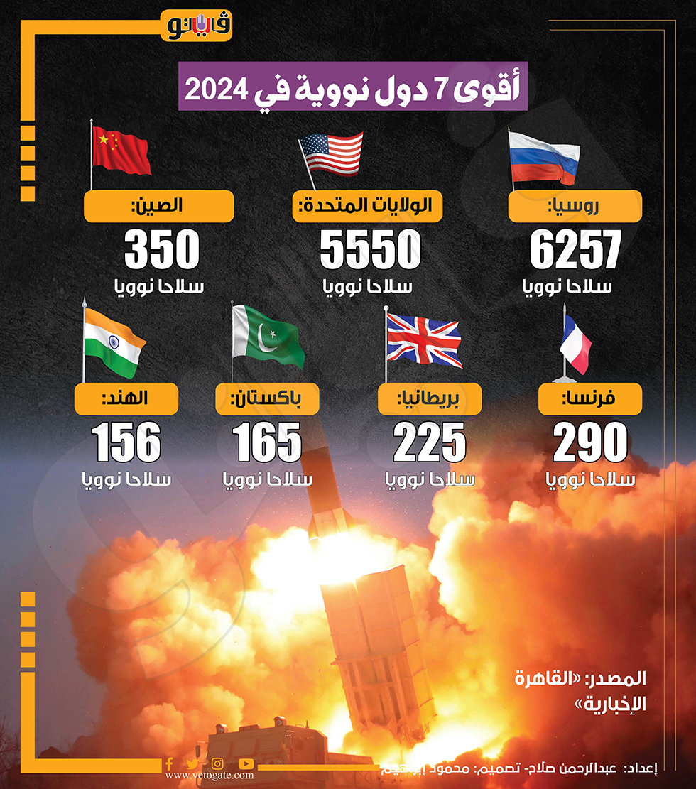 أقوى 7 دول نووية في 2024 (إنفوجراف) الأربعاء 01/مايو/2024 - 09:53 ص 5/1/2024 9:53:06 AM السلاح النووي، فيتو عبدالرحمن صلاح شارك طباعة 18 حجم الخط شارك طباعة السلاح النووي الأسلحة النووية روسيا الولايات المتحدة الصين فرنسا بريطانيا باكستان الهند
