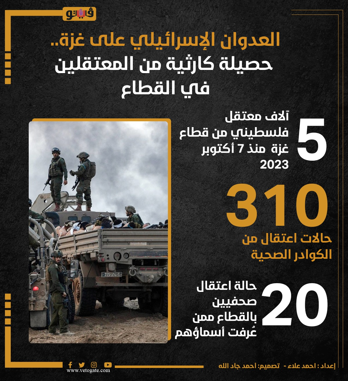 العدوان الإسرائيلي على غزة.. حصيلة كارثية من المعتقلين في القطاع (إنفوجراف) الأربعاء 01/مايو/2024 - 01:30 م 5/1/2024 1:30:31 PM الأسرى الفلسطينيين، فيتو احمد علاء شارك طباعة 18 حجم الخط شارك طباعة العدوان الاسرائيلي علي غزة غزة قطاع غزة جيش الاحتلال حرب الإبادة الجماعية
