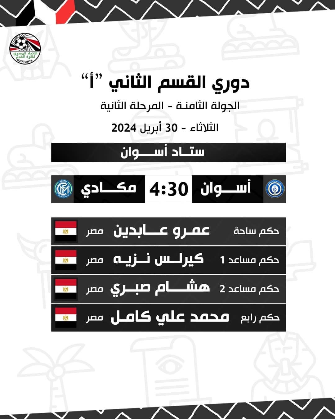 مباراة أسوان ضد مكادي 4.30 عصرًا .