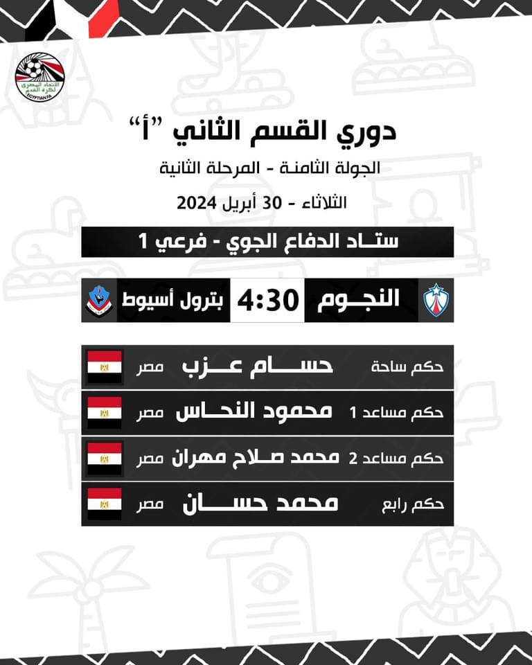 مباراة النجوم ضد بترول أسيوط 4.30 عصرًا.