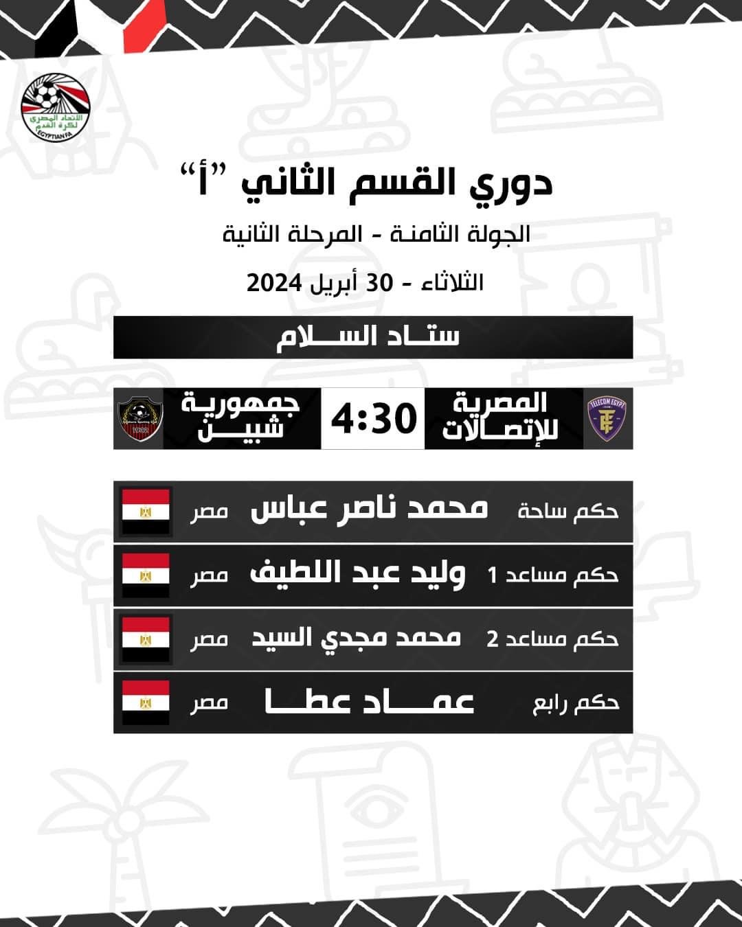 المصرية للاتصالات ضد جمهورية شبين 4.30 عصرًا.
