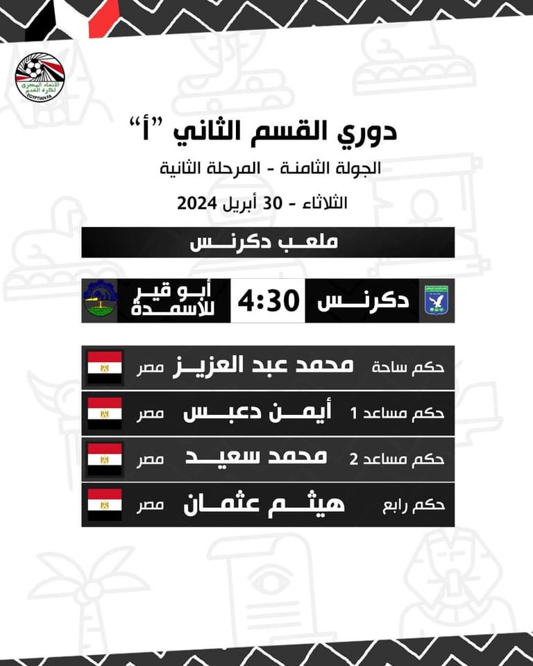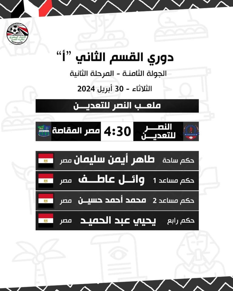 وأعلنت لجنة الحكام باتحاد الكرة المصري، عن حكام مباريات الجولة الثامنة التي ستقام اليوم الثلاثاء ضمن منافسات مجموعة الهبوط من دوري القسم الثاني أ “ دوري المحترفين”.