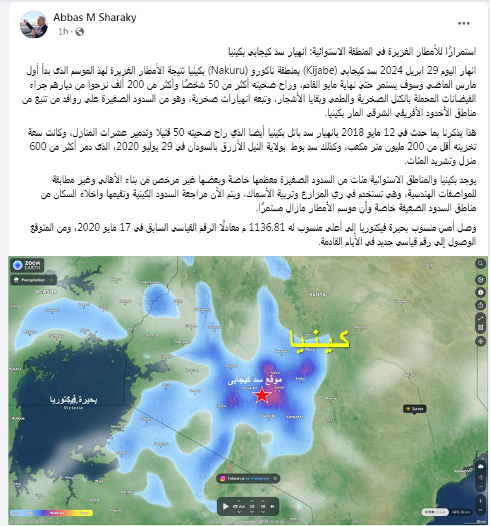 وقال الدكتور عباس شراقي عن انهيار سد كيجابي بكينيا: "استمرارًا للأمطار الغزيرة فى المنطقة الاستوائية: انهيار سد كيجابى بكينيا، انهار في 29 أبريل 2024 سد كيجابى (Kijabe) بمنطقة ناكورو (Nakuru) بكينيا نتيجة الأمطار الغزيرة لهذا الموسم الذى بدأ أول مارس الماضى وسوف يستمر حتى نهاية مايو القادم".
