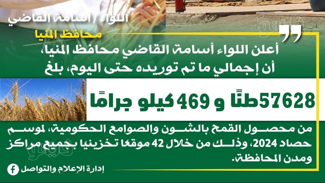 أعلن اللواء أسامة القاضي محافظ المنيا، أن شون وصوامع المحافظة، استقبلت حتى صباح اليوم الثلاثاء ٥٧٦٢٨ طنًا و٤٦٩ كيلو جرام من محصول القمح لموسم حصاد 2024.