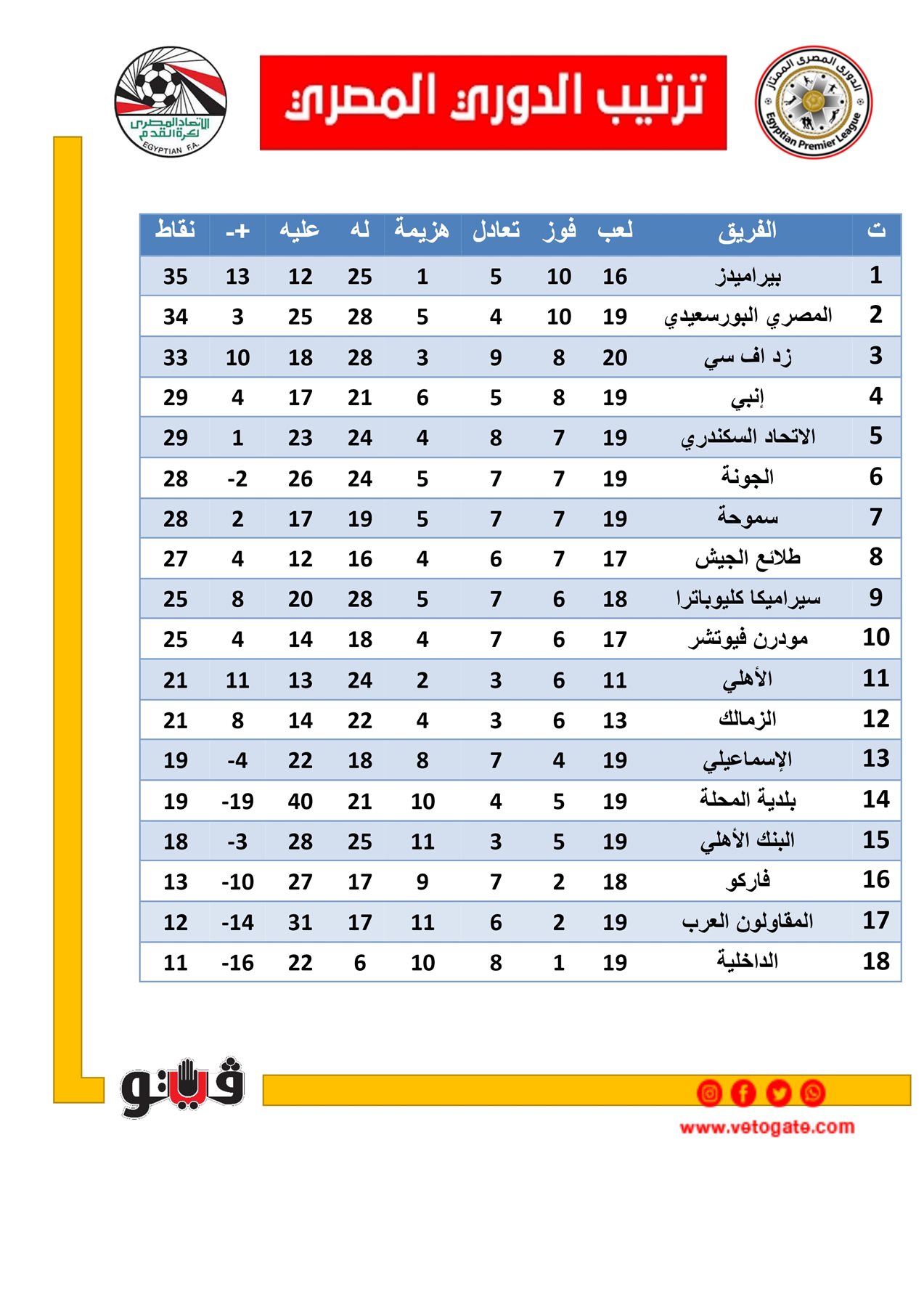 ويتصدر بيراميدز جدول ترتيب الدوري المصري الممتاز برصيد 35 نقطة ويليه المصري في المركز الثاني.