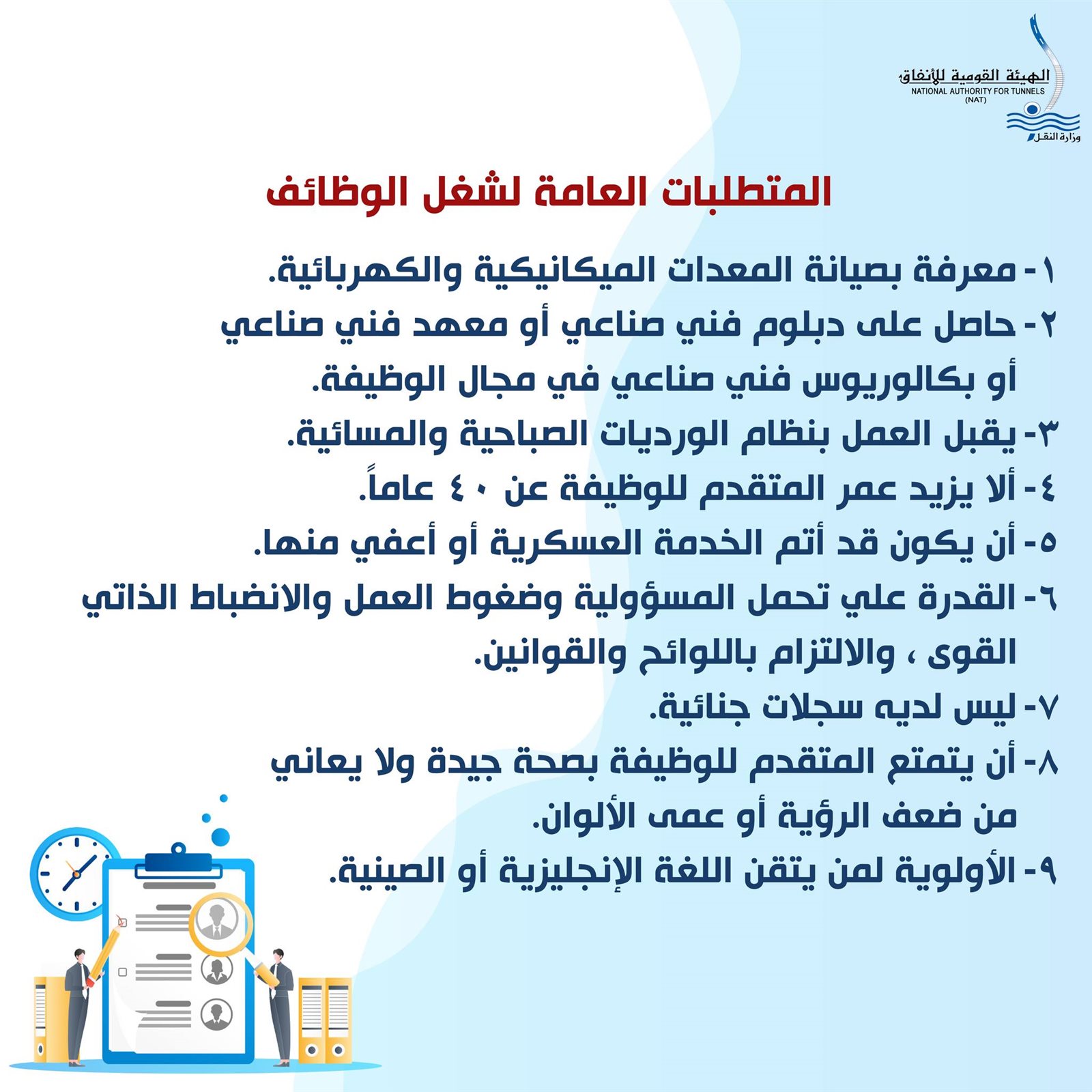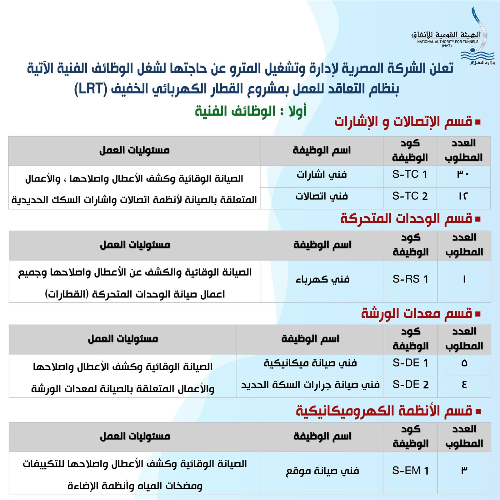أعلنت الشركة المصرية لإدارة وتشغيل مترو الأنفاق، عن حاجتها لشغل عدد من الوظائف الفنية بنظام التعاقد للعمل بمشروع القطار الكهربائي الخفيف (LRT).