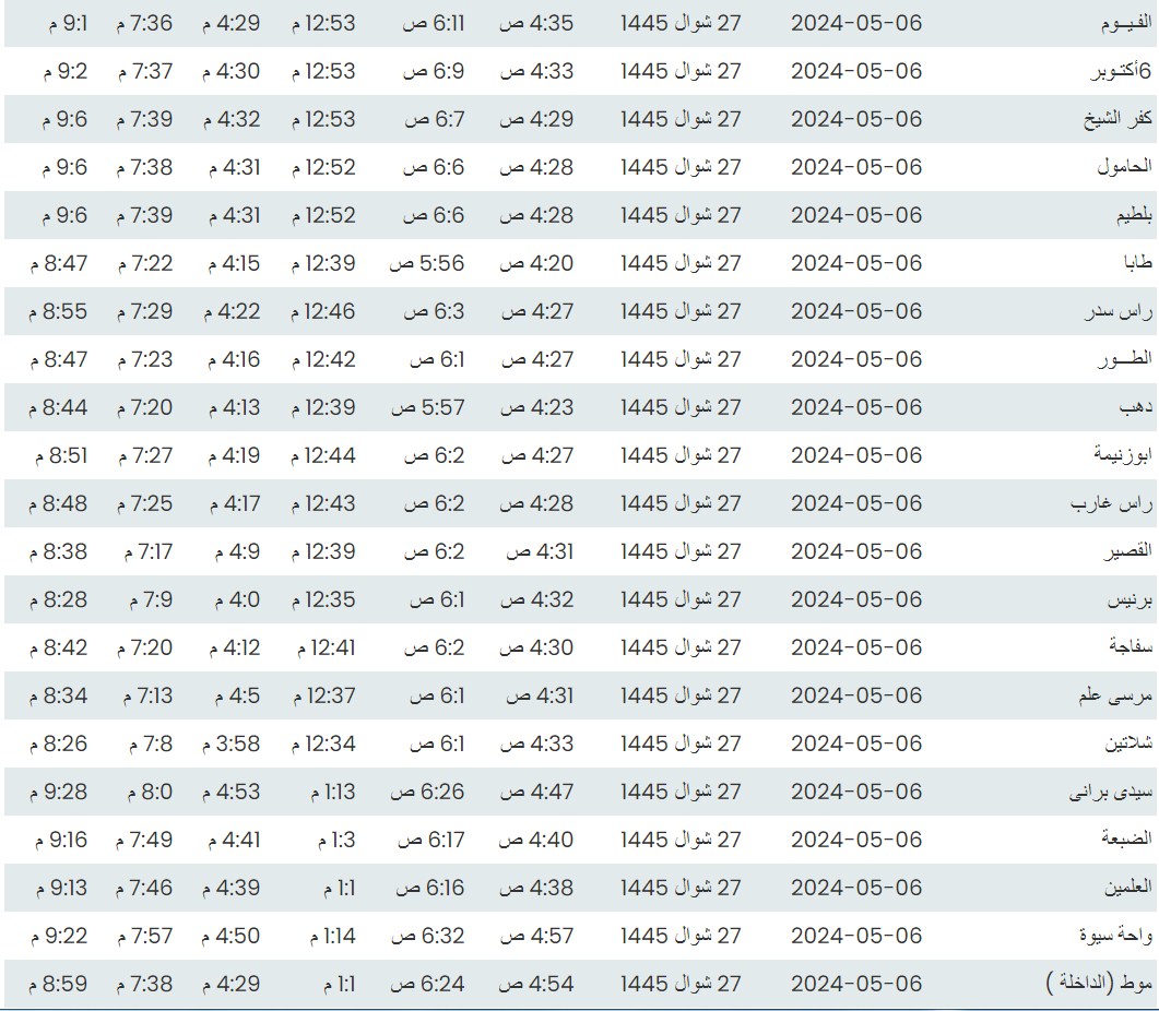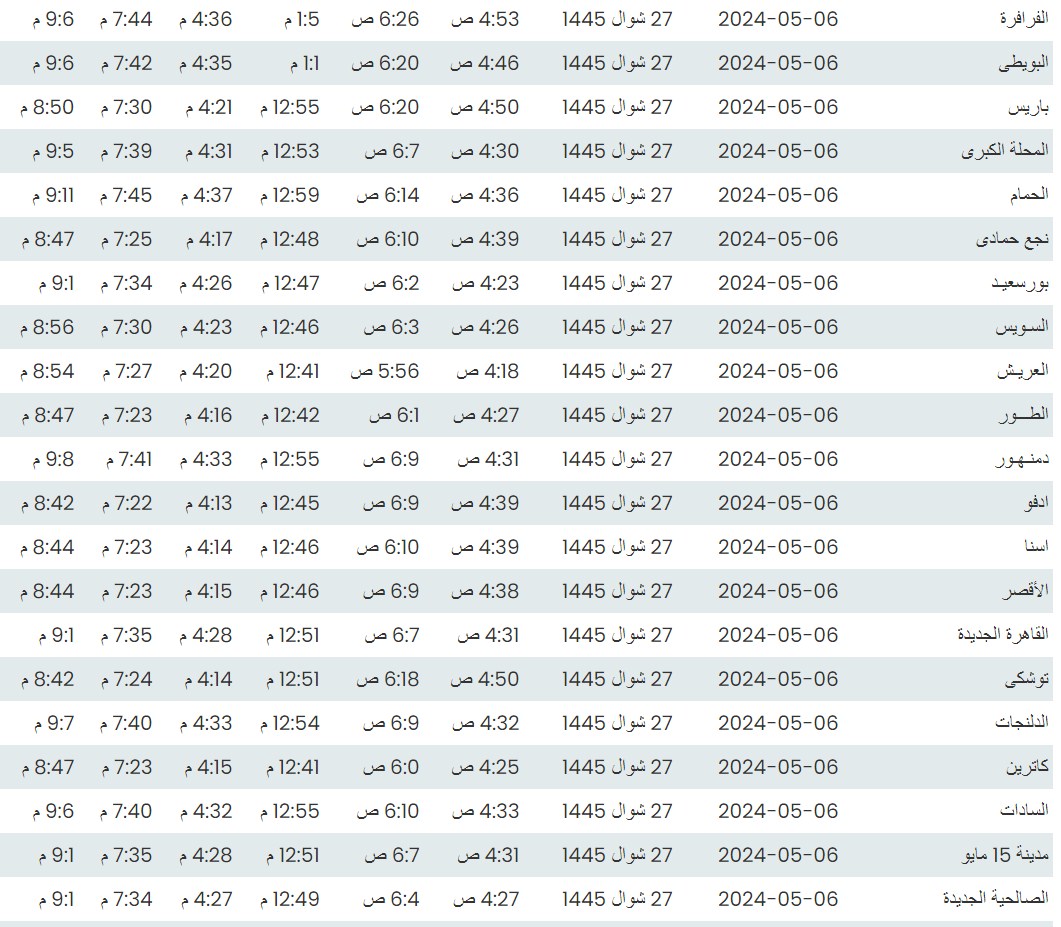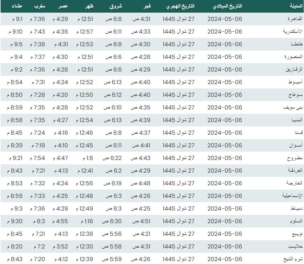وفيما يلي مواقيت الصلاة، لعدد من مدن ومحافظات الجمهورية من واقع بيانات الهيئة العامة للمساحة